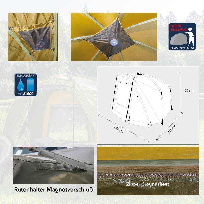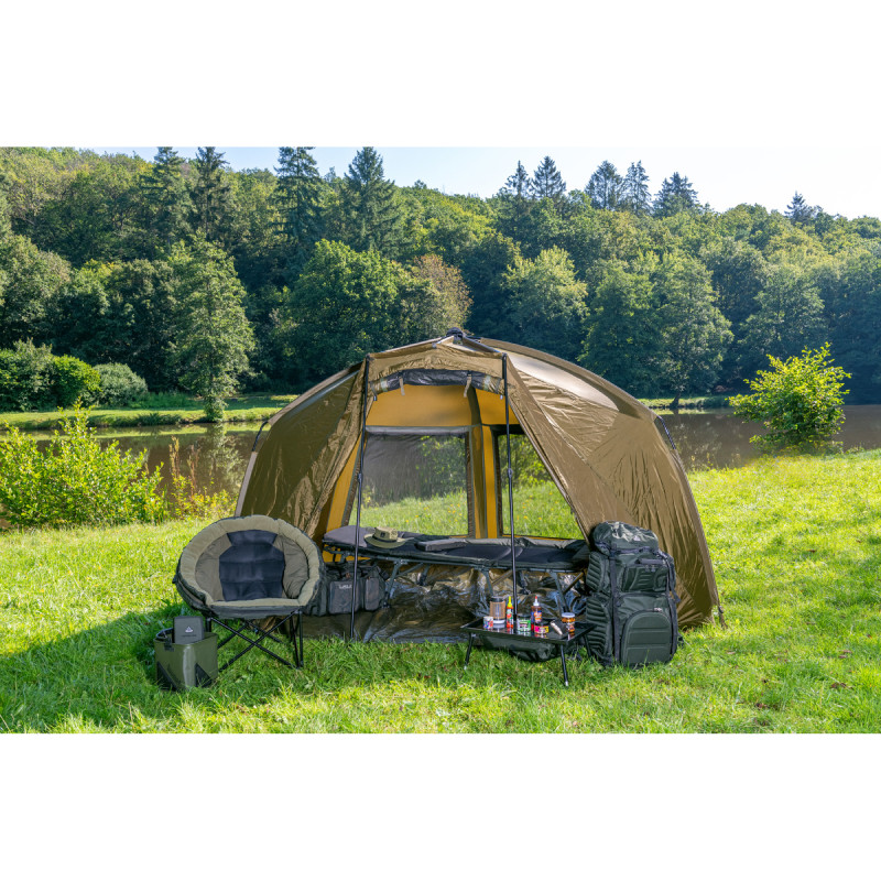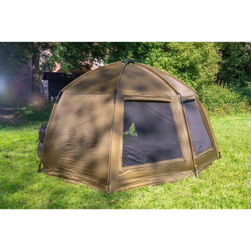 Bivak je vybaven rychloupínacím systémem, který umožňuje jeho rychlé postavení a sbalení, což šetří cenný čas. Magnetické podpěry na pruty a napínací popruhy zvyšují základní stabilitu bivaku. Velká čelní část je odnímatelná pomocí zipového systému a lze ji snadno srolovat a upevnit na boky. Zadní část bivaku je opatřena dvěma velkými okny se síťkou proti hmyzu, která zajišťují optimální cirkulaci vzduchu i během horkých letních dnů.