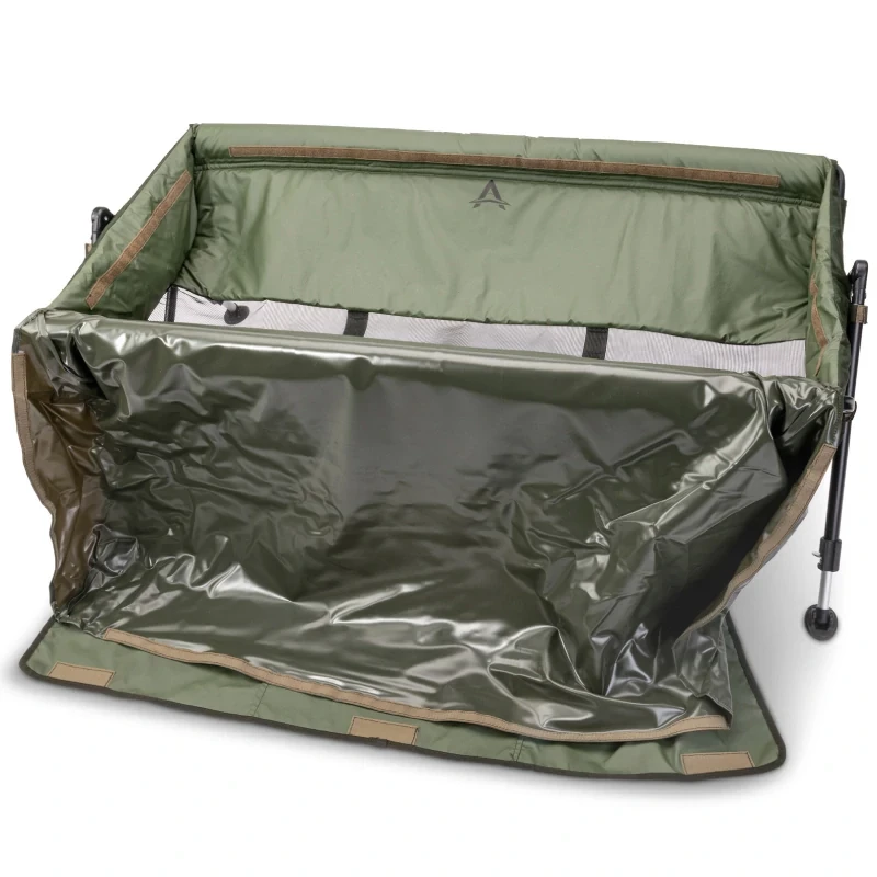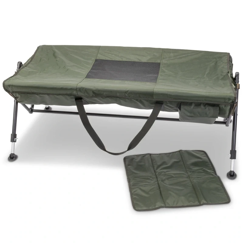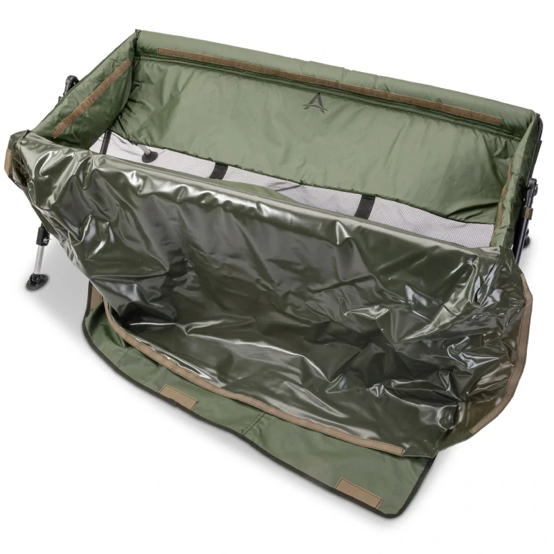 Odtékat či neodtékat? To je ta klíčová otázka, která je často předpokladem nebo právním požadavkem na velkých kaprových jezerech. Anaconda Gentle Credenza Vario 2 je vylepšená verze úspěšné první generace, nyní s ještě více funkcemi. Můžete si zvolit, zda použít luxusní podložku pod ryby s odtokem nebo bez něj. Vodotěsnou „plachtu“ lze během okamžiku připevnit, aby se zabránilo odtékání vody. Podložka má stále výškově nastavitelnou hliníkovou konstrukci a poskytuje rybáři možnost šetrného vyháknutí, přípravy na vážení nebo focení. Vše v jednom multifunkčním systému! S upevněním na suchý zip a plachtou je tato podložka 100% bezpečná. Pro ochranu kolen při fotografování úlovků je na vnější straně podložky připojena vhodná ochranná podložka na kolena.