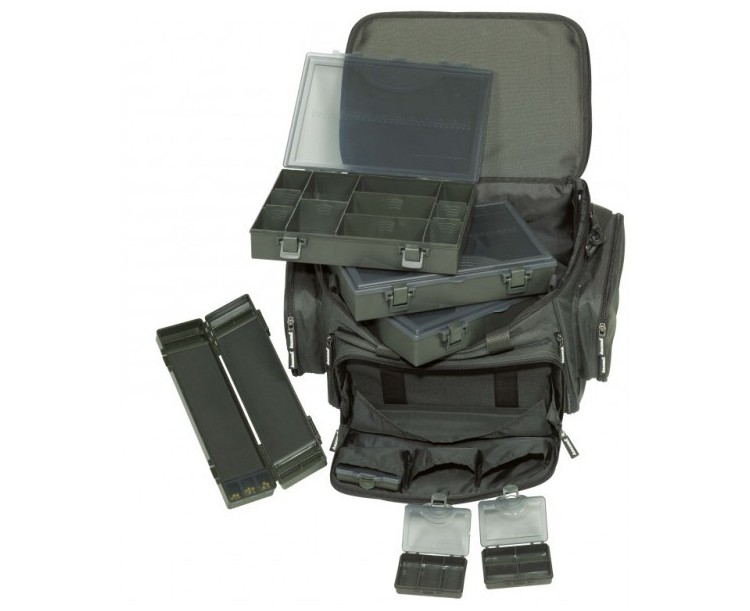 Praktická taška vmaskovaném designu. Vodě odolný polyester zaručuje bezpečné uložení vašeho vybavení. Elegantní vzhled doplňují robustní, kvalitní zipy a extra silně polstrovaný ramenní popruh, díky kterému lze tašku pohodlně přenášet. Součástí tašky jsou dva organizéry na návazce, velký organizační box a 9 dóz na nástrahy.vnitřní rozměry: 40 x 38 x 35 cm3 boční kapsy (22 x 30 x 8 cm a 38 x 10 x 6 cm)2 x pouzdro na návazce9 x dóza na nástrahy1 x silně polstrovaný ramenní popruhzesílená, vodotěsná spodní částmateriál: 600D polyester