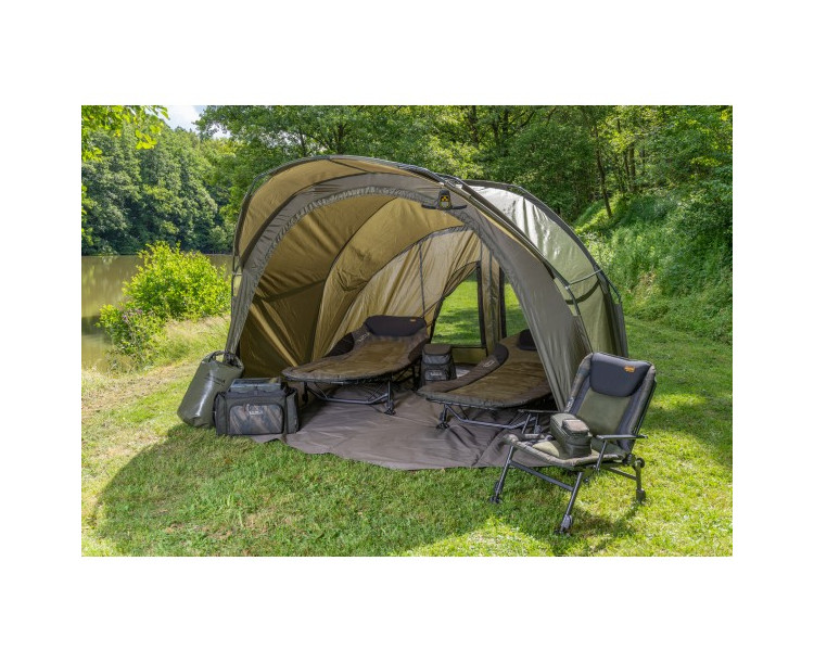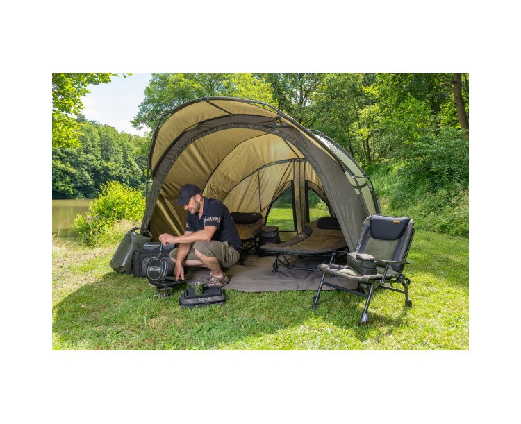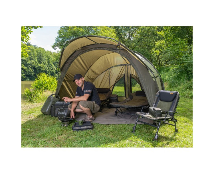 Velmi propracovaný bivak, který byl pečlivě vyvíjen s ohledem na maximální komfort u vody. Velký důraz, byl kladen na maximální odvětrání bivaku, které je velmi důležité v horkých letních měsících. Přístřešek trubkové konstrukce, která se skládá ze tří žeber a o výztuhu se starají rozpěrné tyče. Na tento bivak, byl použit vodě odolný materiál 5 000mm HH, té nejvyšší kvality, který je 100% nepromokavý. Páskou podlepené švy a ukotvení na zavrtávací kolíky, které jsou v ceně přístřešku. Bivak je vybaven větracím systémem jak v přední části, tak velkým oknem v zadní části, které zajistí maximální odvětrání. Velký přední kšilt nad vchodem, je navíc osazen dvěma praktickými úchyty na pruty. Přední vchodová část má, tři výměnné panely na suchý zip, celo zakrytá, nebo slídová a moskytiéra. Další vychytávkou tohoto bivaku je, že v nepřízni počasí můžete ve vchodové části vytvořit okénko, díky použití dvojitých jezdců zipu. Další praktická věc, celí přední panel lze odepnout pomocí zipu a máte otevřený přístřešek. Přístřešek je dodáván s podlážkou, která se k bivaku připne pomocí suchých zipů. Pro lepší a snadnou orientaci osazení podlážky do bivaku, jsme nechali našít 3D označení vstupu. Součástí bivaku je přepravní nylonová taška. Rozměry: Délka: 248cm Šířka: 308cm Výška: 150cm Hmotnost: 10kg Transportní rozměr: 110x20x20cm