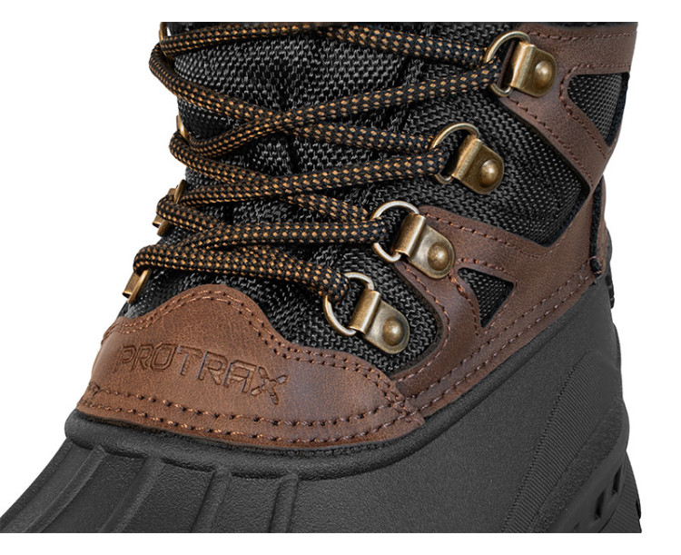 Během zimních měsíců je komfort u vody prioritou, právě proto jsme se rozhodli rozšířit zimní sortiment o obuv, která ochrání vaše nohy před chladem i vlhkostí. Vysoké boty Delphin ProTRAX jsou ideální volbou do nevyzpytatelných zimních podmínek, kdy se potřebujete spolehnout na každý krok. Při vývoji byly použity materiály s důrazem na maximální pohodlí. Spodní část je vyrobena z termoplastické gumy, což zaručuje nízkou hmotnost a dlouhou životnost bot. Zvýšený gumový lem sahá až pod kotníky a spolehlivě chrání vaše nohy před vlhkostí při chůzi přes louže, roztátý sníh či bláto. Gumová podrážka se navíc velmi snadno čistí a její protiskluzový vzor poskytuje stabilitu i na kluzkých površích. Vrchní část boty je vyhotovena z kombinace umělé kůže a síťoviny, která udrží vaše nohy v teple i při velmi nízkých teplotách. Ke zvýšení odolnosti vůči chladu přispívá kombinace fleecového materiálu a jemné umělé kožešiny uvnitř boty. Spojení těchto vlastností zajišťuje pohodlí i při vycházkách v extrémním počasí, například při lovu na dírkách, kde bota přichází do přímého kontaktu s ledem. Pohodlné nošení zajišťují kvalitní šňůrky provlečené přes kovová oka. Pro dokonalé zafixování nohou se ve vrchní části po stranách nacházejí čtyři kovové šněrovací háčky. Výška boty je navržena tak, aby poskytovala odolnost i při vydatné sněhové nadílce. Vrchní lem usnadňuje obouvání a umožňuje jej provést rychle a pohodlně. Hnědo-černé barevné provedení dokonale ladí nejen s rybářskými outfity, ale výborně se hodí i k mysliveckému či ostatnímu outdoorovému oblečení. Pokud chcete spolehlivou obuv, která spojuje teplo, pohodlí a odolnost i v extrémních podmínkách, Delphin ProTRAX jsou tou správnou volbou.