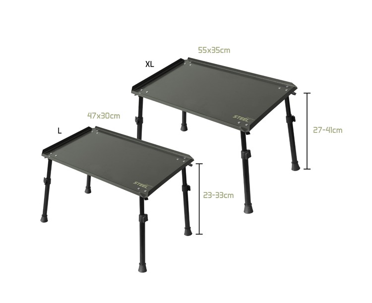 Odolný a praktický stolek STEELS využijete při vázání montáží, stejně jako při ranní kávičce v bivaku či večerním grilování. Kovová pracovní deska stolku má rozměry 47x30cm (verze L). Rohy stolku jsou otevřené kvůli lepšímu odvodu vody, pokud stolek náhodou necháte před bivakem a sprchne. STEELS disponuje robustními teleskopickými nohami. Nastavitelná výška stolku se tak pohybuje v rozmezí 23-33 cm (verze L). Nohy je možné "zamknout" speciálním mechanismem, který předchází nechtěnému zhroucení celého stolku. Patky nohou jsou pogumované. Stolek je dodáván s přepravní taškou.