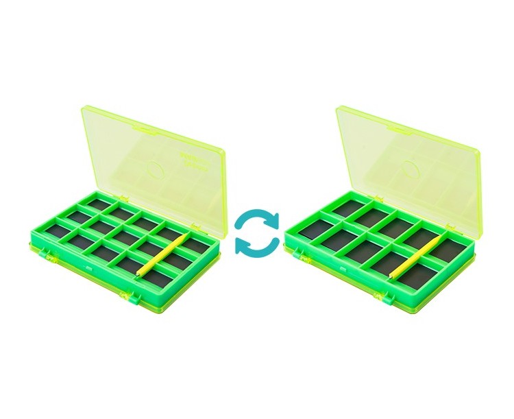 Pomůcka, bez které se neobjede žádný rybář. To je magnetická krabička Delphin MAGBOX, kde uložíte všechny drobné kovové součásti vaší výbavy, samozřejmě nejhojněji zastoupené právě rybářskými háčky. Krabička je oboustranná, na jedné straně se nachází 10 větších (2,5x2,2cm) přihrádek a na druhé 15 menších (2,1x1,3cm). Využitelné ale i pro obratlíky či karabinky. Na základě velikosti či jiných preferencí si jej můžete jednoduše roztřídit do jednotlivých přihrádek, odkud se zaručeně nerozsypou. Navíc se mezi sebou netupí! Budou na svém místě držet až do momentu, kdy se je rozhodnete pomocí přiloženého nástroje použít. Krabička je ve výrazném barevném provedení, a tak nedojde ani k její ztrátě a všechno důležité máte vždy po ruce.