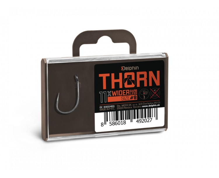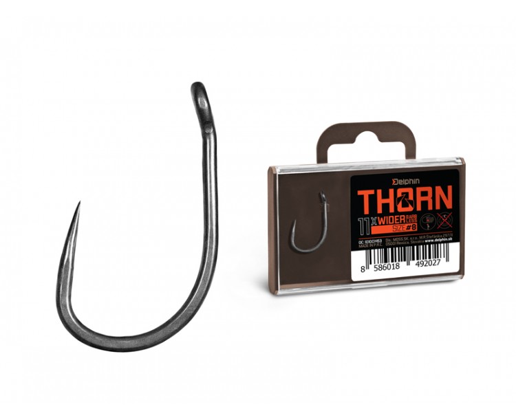 Delphin THORN je prémiová řada kaprařských háčků nejvyšší kvality. Díky moderním technologiím, které byly použity při výrobě jsou tyto háčky synonymem nekompromisní pevnosti a maximální ostrosti. Háčky ze série THORN disponují titanX povrchovou úpravou, čímž nabývají matný šedý povrch, který je navíc dokonale hladký pro snadné proniknutí do kapří tlamy. TitanX se stará také o zpevnění a odolnost celého háčku.