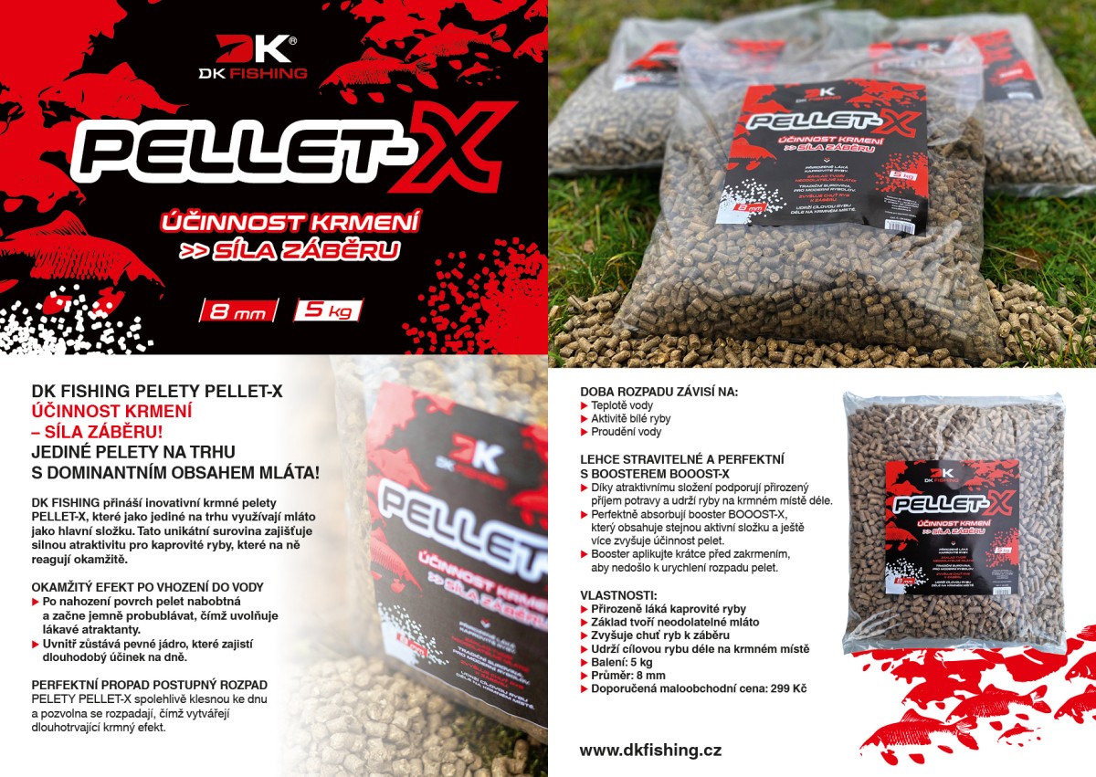 DK FISHING přichází s inovativními krmnými peletami PELLET-X, které jako jediné na trhu využívají mláto jako hlavní výrobní složku. Díky tomu jsou vysoce atraktivní pro kaprovité ryby, které na ně rychle reagují.