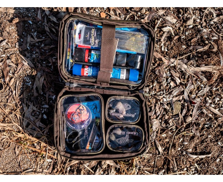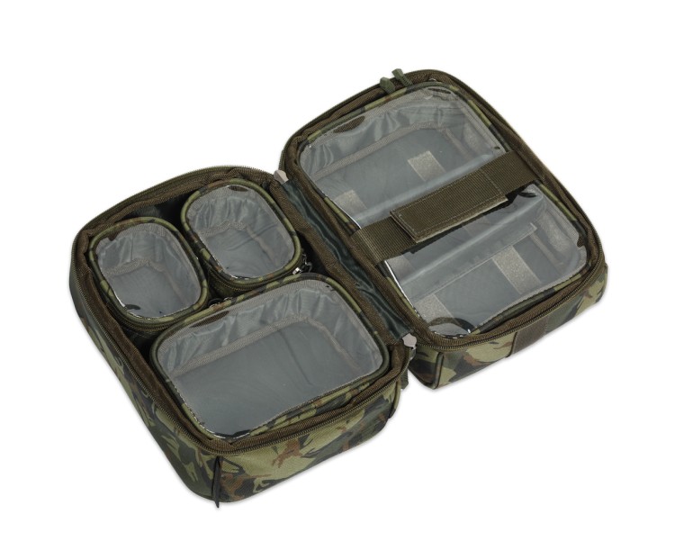 Praktická taška vmaskovaném designu. Vodě odolný polyester zaručuje bezpečné uložení vašeho vybavení. Elegantní vzhled doplňují robustní, kvalitní zipy a extra silně polstrovaný ramenní popruh, díky kterému lze tašku pohodlně přenášet. Součástí tašky jsou dva organizéry na návazce, velký organizační box a 9 dóz na nástrahy.vnitřní rozměry: 40 x 38 x 35 cm3 boční kapsy (22 x 30 x 8 cm a 38 x 10 x 6 cm)2 x pouzdro na návazce9 x dóza na nástrahy1 x silně polstrovaný ramenní popruhzesílená, vodotěsná spodní částmateriál: 600D polyester