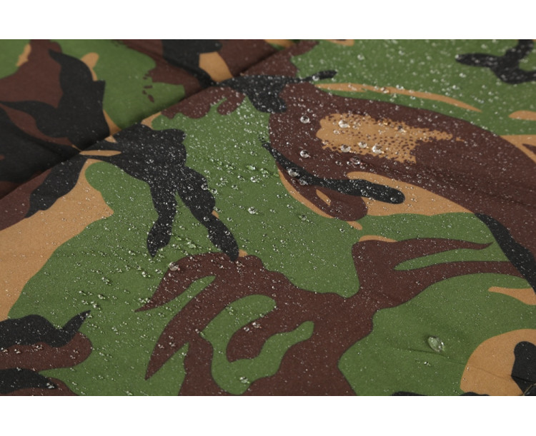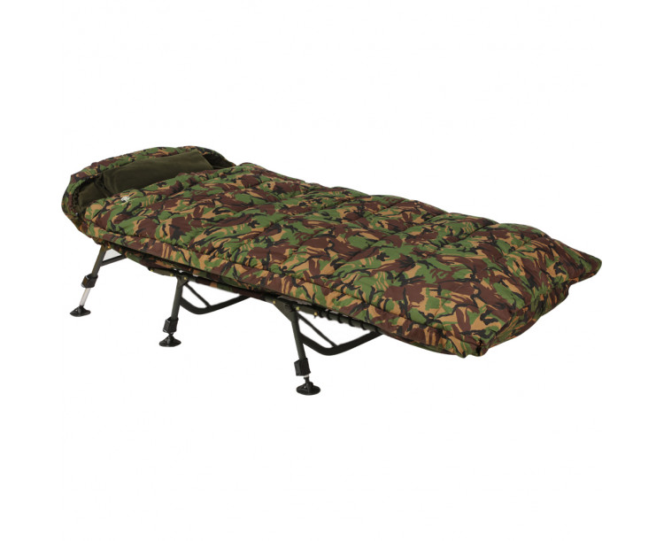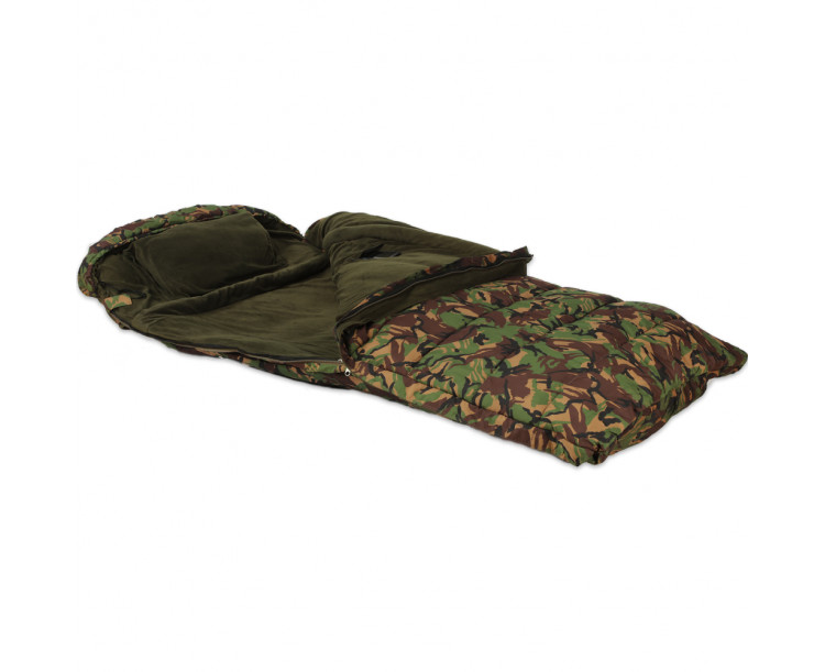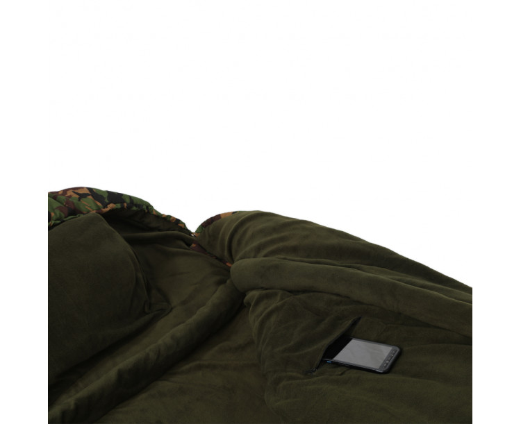 Na vnější vrstvu byl použit velmi příjemný a nešustící materiál „Peach Skin“ broskvová kůže. Tento materiál je nepromokavý a dýchatelný. Plně prošívaný microfleece zelené barvy a vyplněn 100% dutým vláknem pro extrémní teplo a komfort. Zipy jsou po obou stranách, lze je rozepnout až k nohám a jsou izolovány, jak z vnitřní, tak vnější strany, aby se zabránilo nežádoucímu úniku tepla. Ve vnitřní části rybářského spacáku naleznete kapsu na zip, která je určena pro mobilní telefon. Pod hlavou je na zip odnímatelný polštářek, který zajistí opravdový komfort pro rybáře. Na obou stranách spacího pytle (u hlavy a nohou) jsou ze spodu našité převleky, které se pouze přetáhnou přes vršek a spodek lehátka a zajistí tak neomezený a bezpečný pohyb. Ve střední části spacího pytle je popruh, který se díky přezce snadno upevní k lehátku a zabrání kroucení spacího pytle. Spací pytel je dodáván s přenosnou a zesílenou kompresní taškou v camo designu.