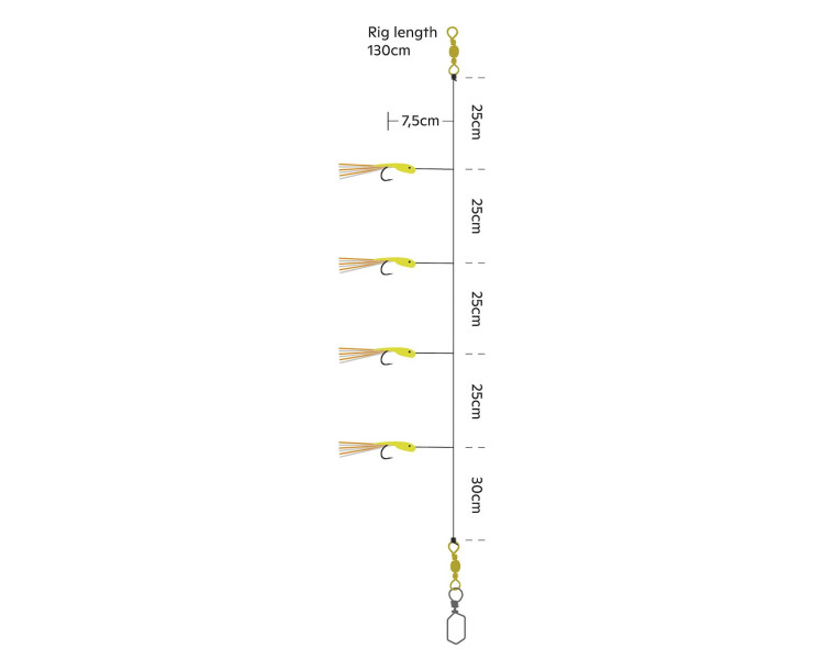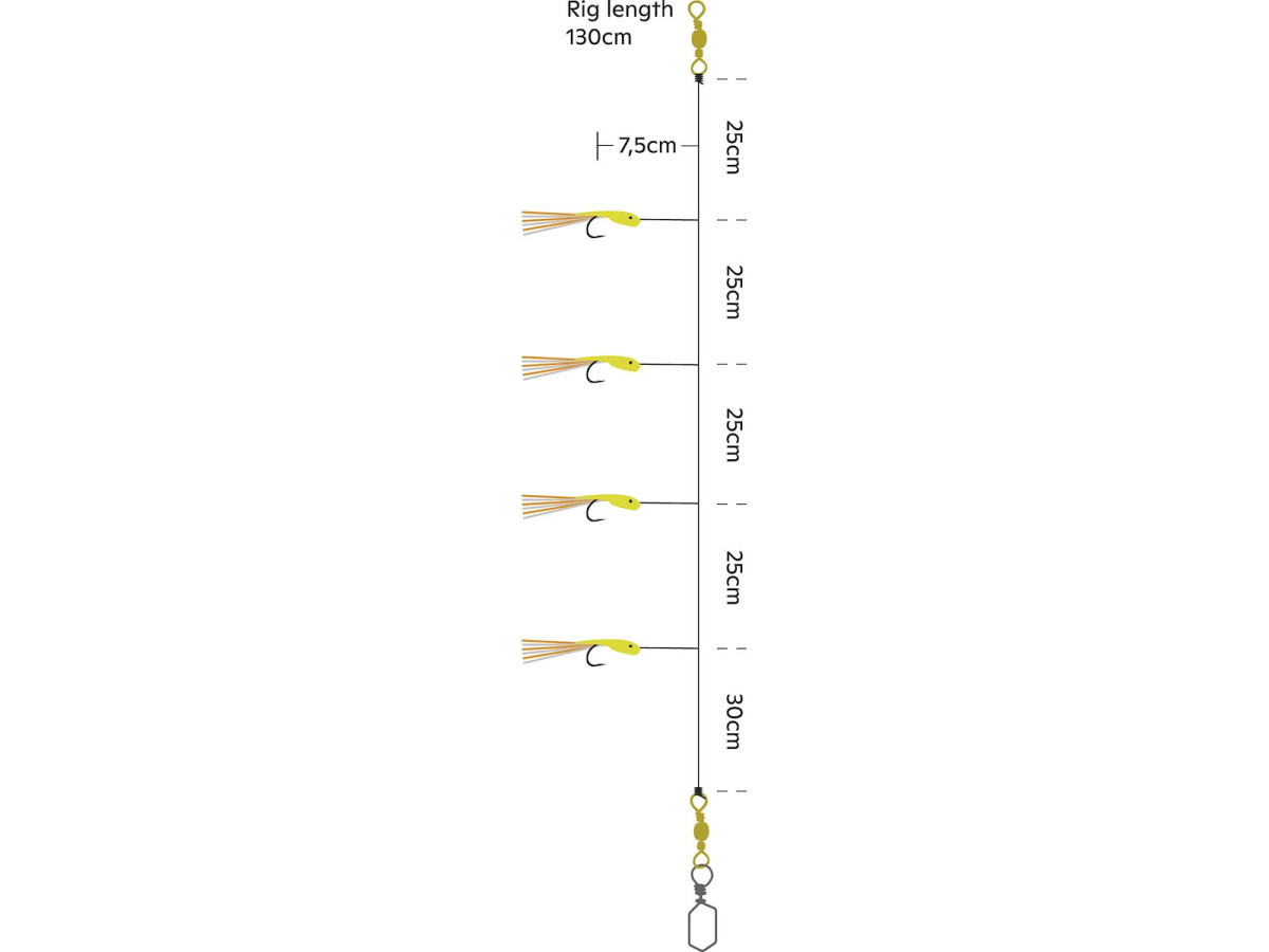 Návazce se silikonovými olihněmi jsou jedny z nejpopulárnějších po celé planetě. Obsahuje 3 silné háčky, krásné barvy a kvalitní vlasec. Kvalitní vlasec Niklové chemicky ostřené háčky Silikonová oliheň Cílová ryba: makrela, treska, merlan Háček #3/0, délka 115 cm, vlasec 0,70 mm