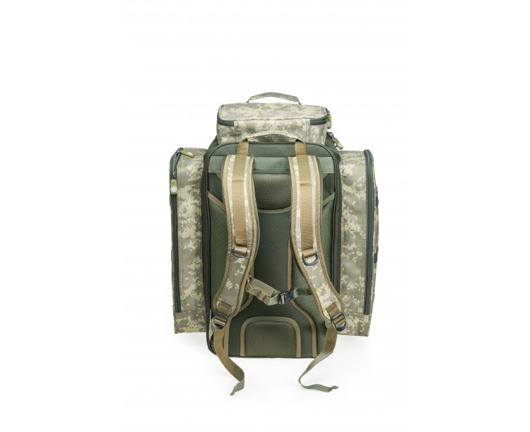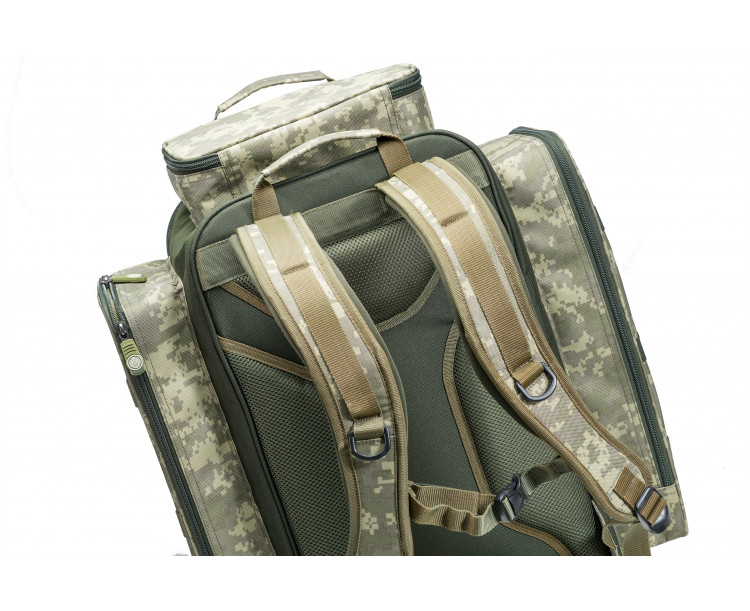 Velký batoh pro pohodlnou přepravu velkého množství rybářského vybavení. Je uzpůsoben ke snadnému zasunutí pod lehátko. Hlavní komora je snadno přístupná díky kompletně otevíratelné přední stěně. Pět velmi prostorných vnějších kapes umožňuje přehledné uložení systémových boxů a celé řady drobného příslušenství. Polstrované popruhy i anatomicky tvarovaná a odvětraná zádová část umožňují pohodlné nošení naplněného batohu i na delší vzdálenosti. Odolný, nepromokavý a snadno omyvatelný materiál B-POL600D v CamoCODE včetně originálních táhel zipů podtrhují prémiovou kvalitu tohoto batohu.