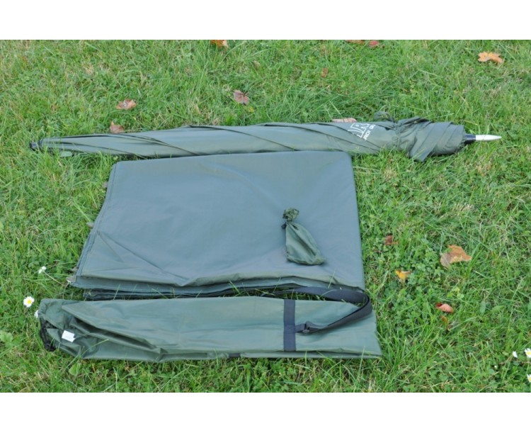 Nový kvalitní deštník s kloubem a bočnicemi. Je vybaven silnostěnnou tyčí, odolnou proti deformaci. Potah je vyroben z lehkého, avšak 100% nepropustného „pogumovaného“ materiálu zelené barvy s lepenými švy.