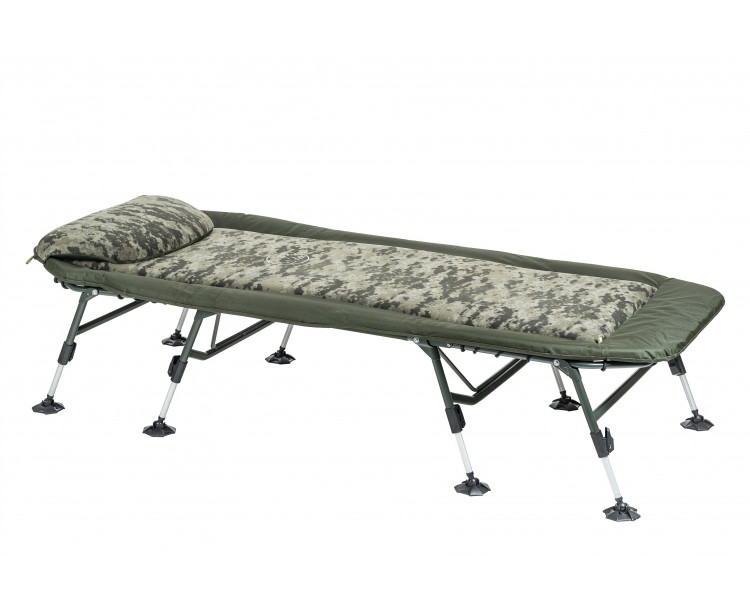 Extrémně lehké, velké a 100% ploché lehátko ve velice atraktivním designu s digitálním maskováním. Nadstandardně silná a velmi komfortní matrace s fleecovou vrchní vrstvou nabízí nejúčinnější systém regulace tuhosti pomocí elastického šněrování na spodní straně. Další výhodou jsou nohy s rozměrnými výkyvnými patkami a možností velkého vysunutí. Lehátko je dostupné ve variantě s osmi nebo se šesti nohami. Technické parametry: Hmotnost: 9,54 kg Nosnost: 160 kg Transportní rozměr: 90 x 80 x 30 cm Počet nohou: 8 Rozměr: 205 x 80 cm
