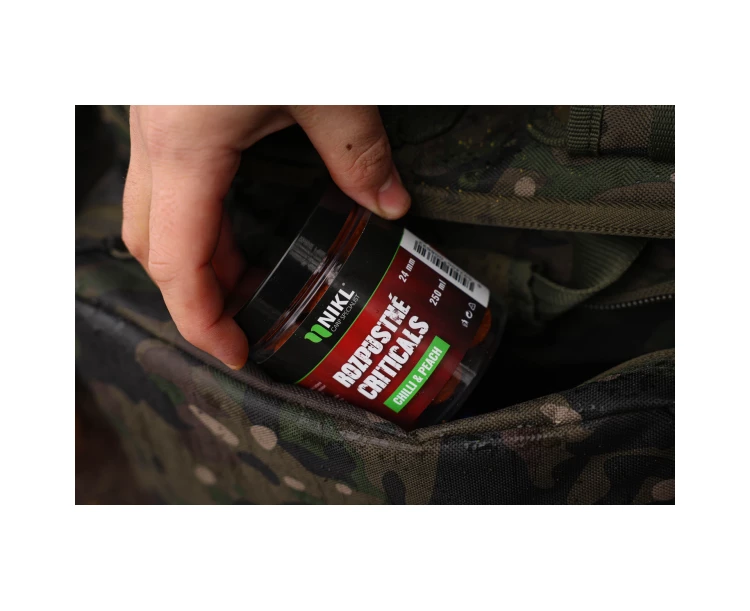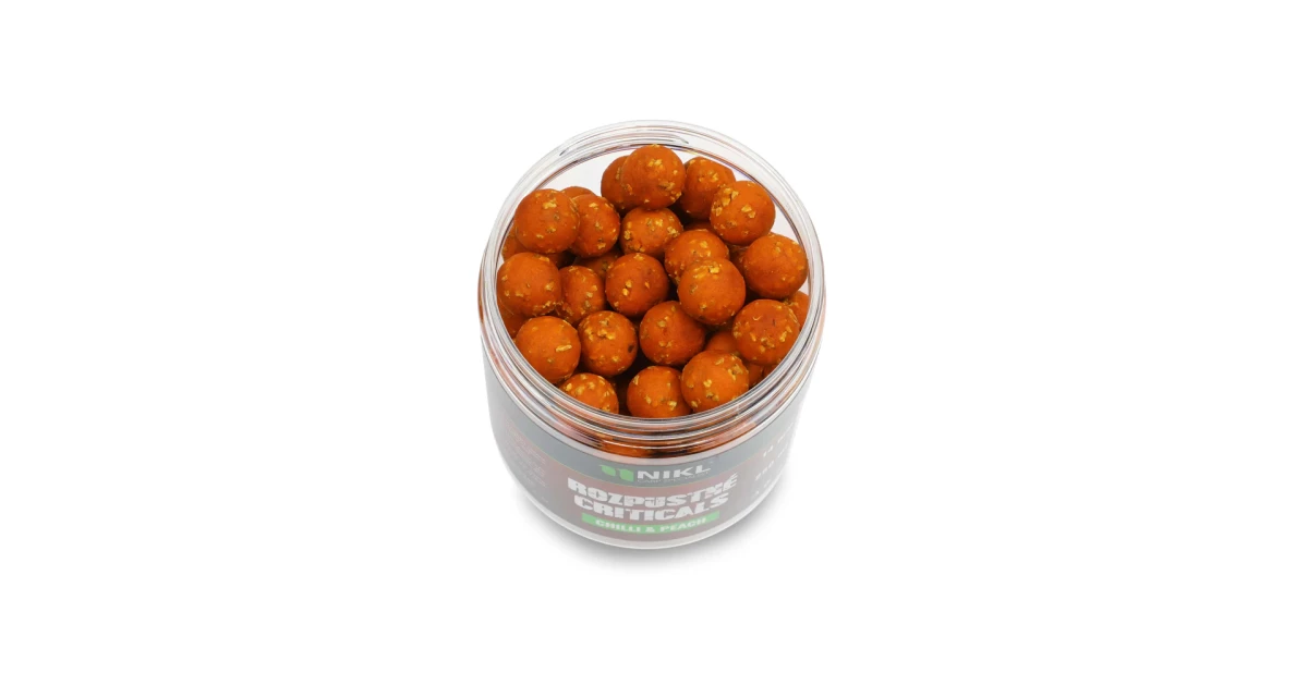 Rozpustné Criticals boilie Chilli & Peach v balení 250 ml. Skvělá nástraha určená výhradně pod háček, navržená pro záběr v co nejkratším čase. Po několika minutách ve vodě se začne pozvolna rozpouštět a uvolňovat esence, atraktory a moučky, což je pro kapry velmi přitažlivé a často způsobí, že při krmení sáhnou po nástraze dříve než po ostatním krmení. Kolem montáže postupně vytváří stabilní potravní signál, který se šíří přirozeně a drží pozornost ryb přímo u nástrahy i v náročných podmínkách nebo na tlakových vodách.