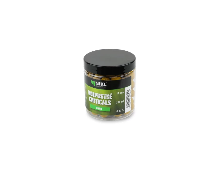 Rozpustné Criticals boilie Corn v balení 250 ml. Skvělá nástraha určená výhradně pod háček, navržená pro záběr v co nejkratším čase. Po několika minutách ve vodě se začne pozvolna rozpouštět a uvolňovat esence, atraktory a moučky, což je pro kapry velmi přitažlivé a často způsobí, že při krmení sáhnou po nástraze dříve než po ostatním krmení. Kolem montáže postupně vytváří stabilní potravní signál, který se šíří přirozeně a drží pozornost ryb přímo u nástrahy i v náročných podmínkách nebo na tlakových vodách.