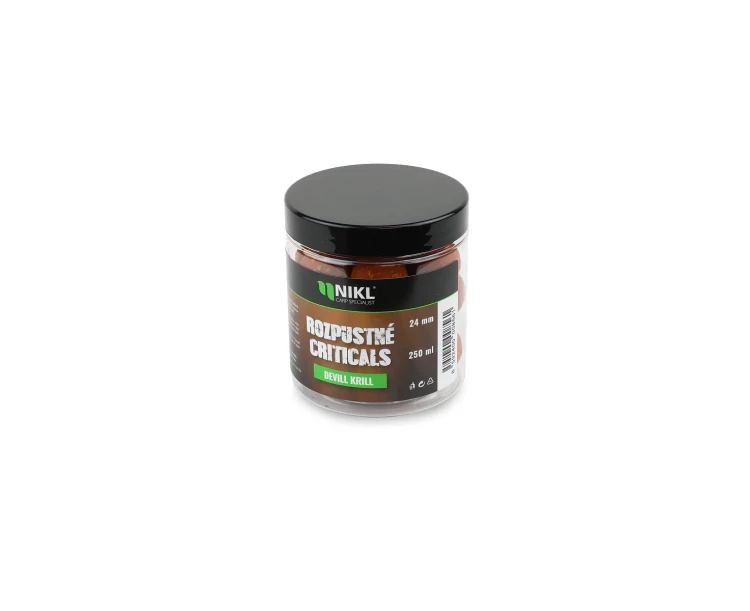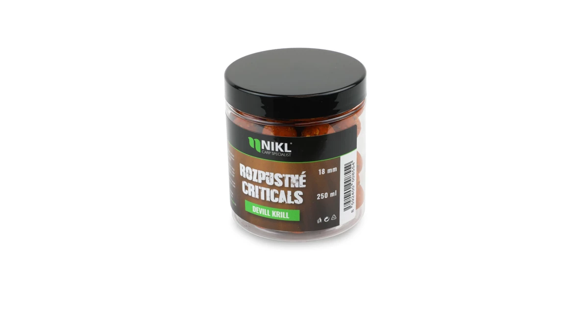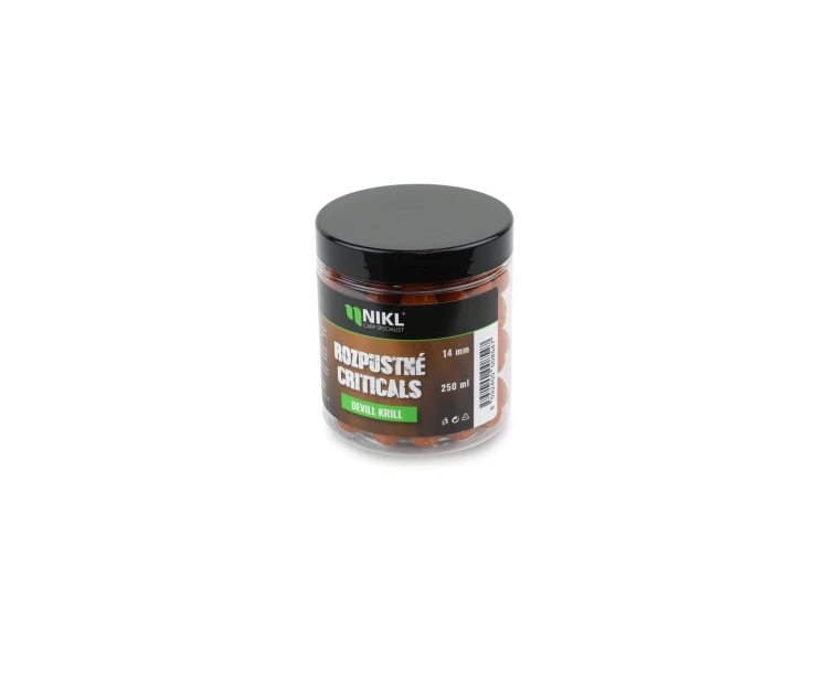 Rozpustné Criticals boilie Devill Krill v balení 250 ml. Skvělá nástraha určená výhradně pod háček, navržená pro záběr v co nejkratším čase. Po několika minutách ve vodě se začne pozvolna rozpouštět a uvolňovat esence, atraktory a moučky, což je pro kapry velmi přitažlivé a často způsobí, že při krmení sáhnou po nástraze dříve než po ostatním krmení. Kolem montáže postupně vytváří stabilní potravní signál, který se šíří přirozeně a drží pozornost ryb přímo u nástrahy i v náročných podmínkách nebo na tlakových vodách.