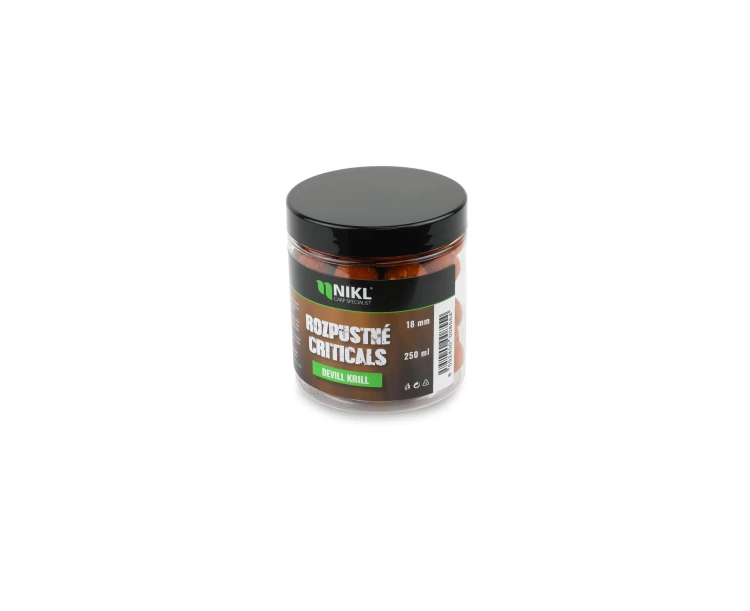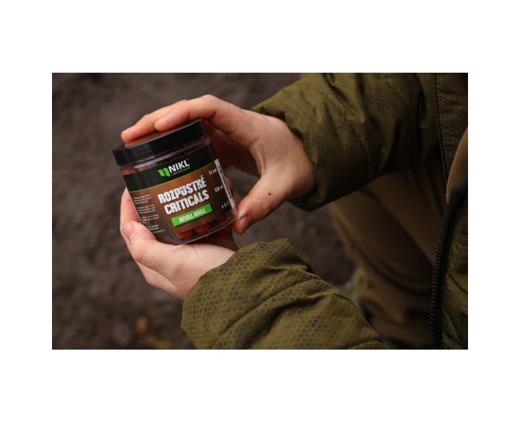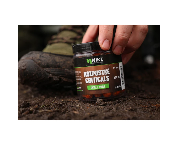 Rozpustné Criticals boilie Devill Krill v balení 250 ml. Skvělá nástraha určená výhradně pod háček, navržená pro záběr v co nejkratším čase. Po několika minutách ve vodě se začne pozvolna rozpouštět a uvolňovat esence, atraktory a moučky, což je pro kapry velmi přitažlivé a často způsobí, že při krmení sáhnou po nástraze dříve než po ostatním krmení. Kolem montáže postupně vytváří stabilní potravní signál, který se šíří přirozeně a drží pozornost ryb přímo u nástrahy i v náročných podmínkách nebo na tlakových vodách.