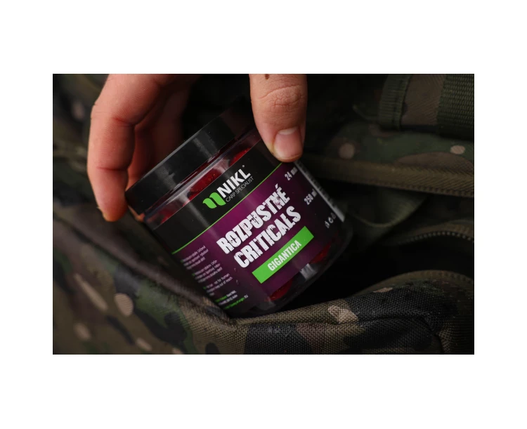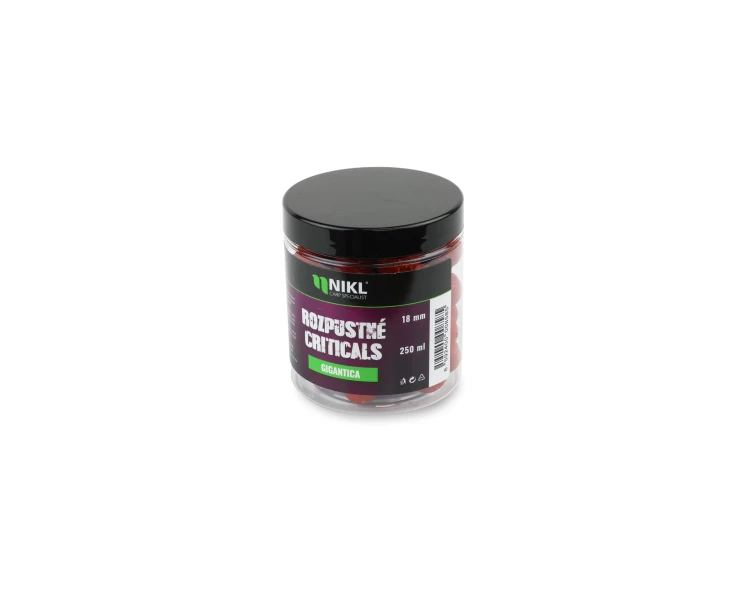 Rozpustné Criticals boilie Gigantica v balení 250 ml. Skvělá nástraha určená výhradně pod háček, navržená pro záběr v co nejkratším čase. Po několika minutách ve vodě se začne pozvolna rozpouštět a uvolňovat esence, atraktory a moučky, což je pro kapry velmi přitažlivé a často způsobí, že při krmení upřednostní právě tuto nástrahu před ostatním krmením. Postupně vytváří kolem montáže stabilní potravní signál, který se šíří přirozeně a drží pozornost ryb přímo u nástrahy i v náročných podmínkách nebo na tlakových vodách.