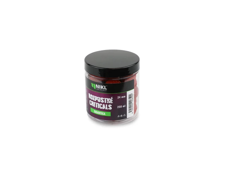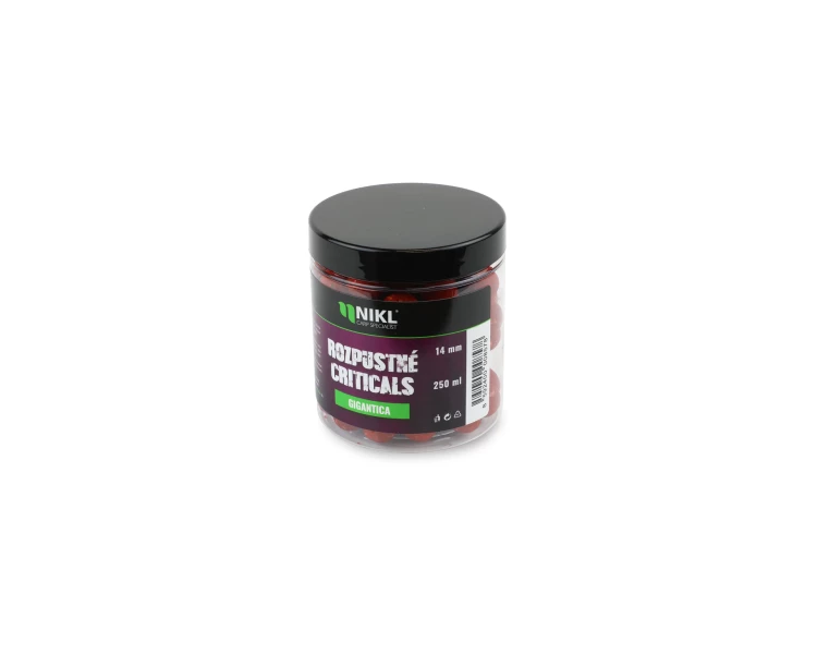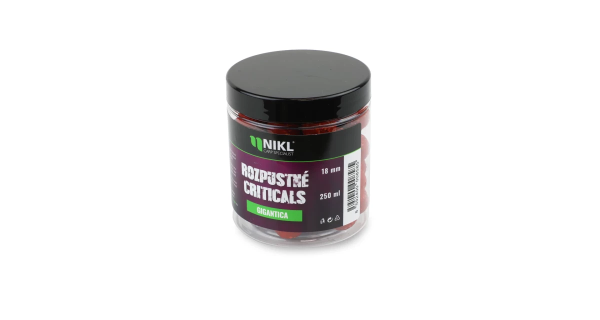 Rozpustné Criticals boilie Gigantica v balení 250 ml. Skvělá nástraha určená výhradně pod háček, navržená pro záběr v co nejkratším čase. Po několika minutách ve vodě se začne pozvolna rozpouštět a uvolňovat esence, atraktory a moučky, což je pro kapry velmi přitažlivé a často způsobí, že při krmení upřednostní právě tuto nástrahu před ostatním krmením. Postupně vytváří kolem montáže stabilní potravní signál, který se šíří přirozeně a drží pozornost ryb přímo u nástrahy i v náročných podmínkách nebo na tlakových vodách.