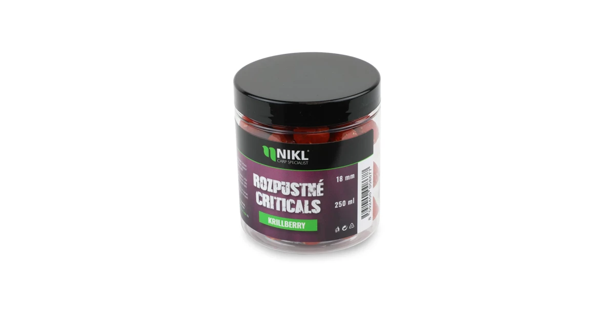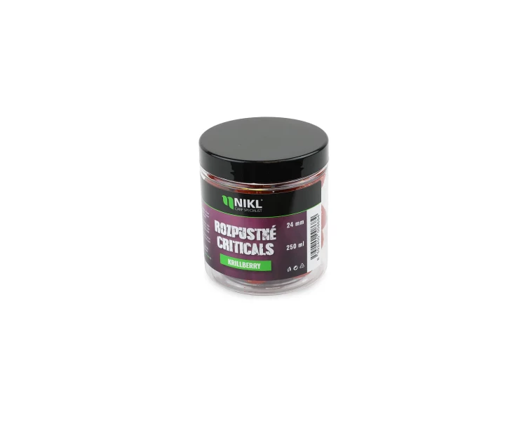 Rozpustné Criticals boilie Krill Berry v balení 250 ml. Skvělá nástraha určená výhradně pod háček, stavěná na záběry v co nejkratším čase. Po několika minutách ve vodě se začne pozvolna rozpouštět a uvolňovat esence, atraktory a moučky, což je pro kapry mimořádně přitažlivé a často vede k tomu, že při krmení upřednostní právě nástrahu před ostatním krmením. Postupně vytváří kolem montáže stabilní potravní signál, který se šíří přirozeně a drží pozornost ryb přímo u nástrahy i v náročnějších podmínkách nebo na tlakové vodě.