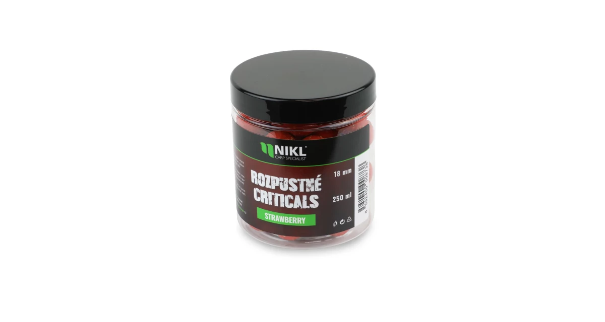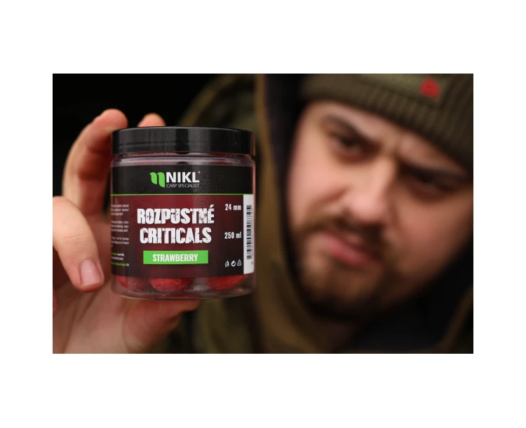Rozpustné Criticals boilie Strawberry v balení 250 ml. Skvělá nástraha určená výhradně pod háček, stavěná na záběry v co nejkratším čase. Po několika minutách ve vodě se začne pozvolna rozpouštět a uvolňovat esence, atraktory a moučky, což je pro kapry mimořádně přitažlivé a často vede k tomu, že při krmení upřednostní právě nástrahu před ostatním krmením. Postupně vytváří kolem montáže stabilní potravní signál, který se šíří přirozeně a drží pozornost ryb přímo u nástrahy i v náročnějších podmínkách nebo na tlakové vodě.