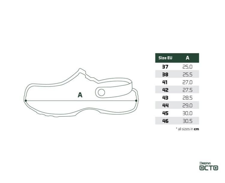 Od počátku vývoje tohoto produktu bylo naším záměrem přinést designově jedinečné vsuvky, které budou splňovat požadavky rybářů na maximální funkčnost a komfort během nošení nejen na rybách, ale i v běžném životě. A výsledek? Delphin OCTO - ultra lehké pantofle z EVA pěny, inspirované přírodou, kompletně navrženy a vyráběny v Evropské unii! Vzhledem k tomu, že během rybolovu je nutné často chodit po nerovném terénu, jsme se při vývoji zaměřili na podešev, která je podstatně pevnější a masivnější ve srovnání s levnějšími konkurenčními modely. Právě to zaručuje, že chození v těchto vsuvkách bude maximálně komfortní a dokonale odfiltruje nerovnosti terénu. Při podešvi ještě chvíli zůstaneme. Právě tam začíná příběh názvu OCTO. Stylizovali jsme ji totiž do tvaru přísavek chapadel chobotnice, což zaručuje výborný grip za každých podmínek. Právě chobotnice, anglicky OCTOpus, anebo latinsky OCTOpod byly inspirací pro kompletní design a název ve zkrácené forme - OCTO. Dalším sofistikovaným prvkem jsou velké postranní otvory, jejichž prioritním úkolem je starat se o odvětrávání a celkovou vzdušnost v této obuvi. Záměrně nejsou navrženy ve výši podrážky, jak to bývá standardem, ale o něco výše. Právě tento detail hraje významnou roli během pobytu na břehu, či mělké vodě. Tím, že otvory jsou o něco vyšší nad vnitřní stélkou je téměř eliminováno nechtěné nabírání písku či kamínků mezi podrážku a chodilo. Vaše chodidla jsou tedy chráněny v maximální možné míře. Kromě těchto otvorů slouží k odvětrávání hustá perforace umístěna ve vrchní části. Ta je záměrně vytvarována na jedné straně do symbolu D z loga Delphin, na druhé vsuvce zase kraluje symbol O, jako počáteční písmeno názvu OCTO. Celkový dojem ještě zhodnocuje jemná struktura na povrchu pantoflí, která evokuje kůži chobotnice. Díky použitému EVA materiálu jsou mimořádně lehké, houževnaté a dokonce plovoucí. Samozřejmostí je u tohoto modelu poutko na fixaci paty (lidově nazývané i uzávěrka), které oceníte zejména v nerovné, či svahovitejšom terénu. Delphin OCTO jsou jednoduše stylovou letní obuví, jedinečného designu, s velmi širokým využitím. Ať už potřebujete přezůvky do interiéru, jít na ryby, vykoupat se, neboli do města. OCTO jsou tu aby vás převedli všemi nástrahami dne komfortně a s lehkostí. Jediným mínusem je, že nejsou vhodné pro vysokohorskou turistiku, to však díky ostatní všestrannosti určitě oželíte :) Jelikož jsou pantofle vyrobeny z EVA materiálu, vedle množství výhod třeba dbát i na péči o tento materiál. Nenechávejte ho proto vystaven dlouhodobě přímému prudkému slunečnímu záření na rozpálených kamenech či betonu. Právě tam může teplota atakovat až 50 stupňů Celsia, což může způsobit jemné tvarové deformace. Samozřejmě, pokud jsou pantofle na nohách, k takovému jevu nedochází a životnost se počítá na roky.