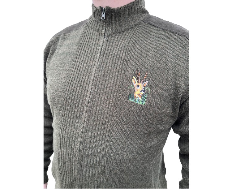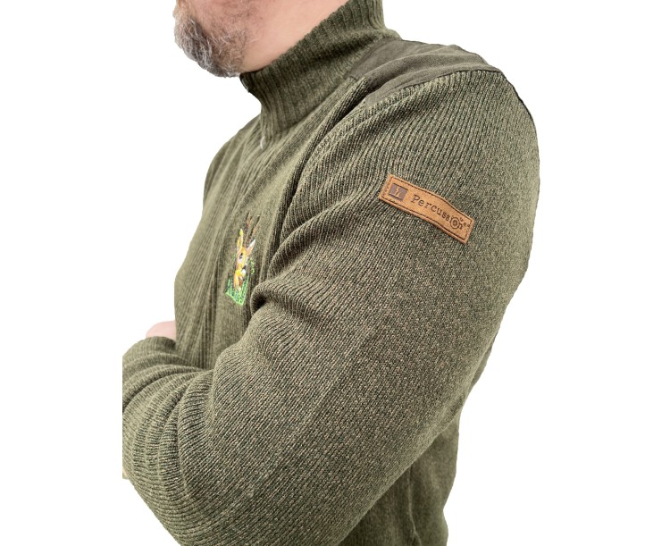 Svetr od prémiové francouzské lovecké značky Percussion v zeleném provedení disponuje celorozepínacím zipem pro snadné oblékání a svlékání. Další přednosti tohoto svetru jsou zesílené nášivky na ramenou, elastické rukávy, elastický pas a dvě malé kapsy na zahřátí rukou. Na prsou se nachází elegantní nášivka se vzorem. Jedná se o pohodlný všestranný svetr vhodný na celoroční použití.