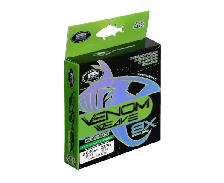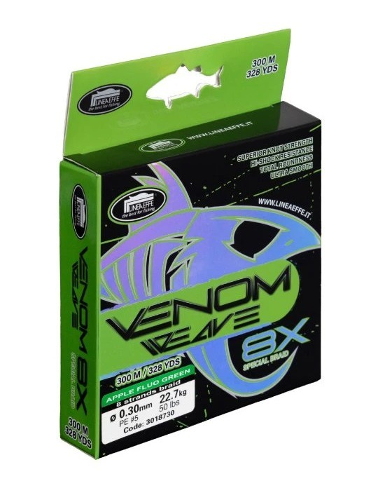 Kvalitní pletená šňůra Lineaeffe Venom wave 8X vyniká díky hustému pletení 8 vláken vysokou nosnostní a oděruvzdorností. Kulatý profil šňůry zajišťuje hladký a minimálně nasákavý povrch a tak lze dosáhnout velmi dalekých a přesných hodů. Limetkově zelená barva zajišťuje dobrou viditelnost a zlepšuje přesnost identifikace jemných záběrů a zlepšuje přesnost náhozů. Díky nulové průtažnosti se veškeré informace od nástrahy okamžitě přenášejí do špičky pruty a ruky rybáře a tak lze ihned reagovat i na ty nejjemnější záběry.