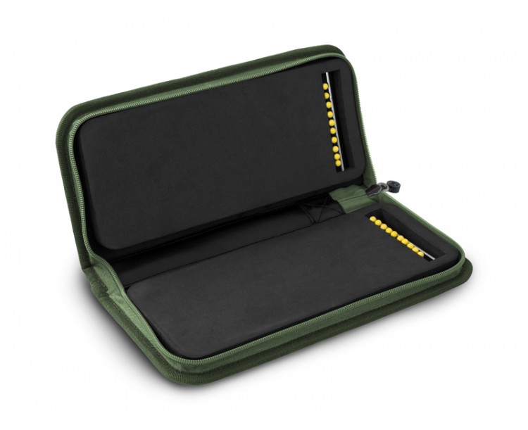 Delphin Rig SPACE slouží k uložení kaprařských i jiných návazců. Pouzdro je jednoduché konstrukce, avšak již dílenské vypracování svědčí o jeho kvalitě a životnosti. Z vnější strany je pouzdro zcela vyztuženo a potaženo odolným materiálem. Uvnitř se nachází vrstva PVC, na které je upevněn tvrzený molitan. Také se zde nachází 20 kusů špendlíků s kulatými hlavičkami, díky čemuž je jejich zatlačování velmi pohodlné.Kombinace vnějšího materiálu s vnitřní vrstvou PVC zajistí, že vaše návazce budou vždy dokonale chráněny a připraveny k okamžitému použití. Pouzdro je osazeno zipem s kovovým běžcem, na kterém je stylový držák s logem Delphin.