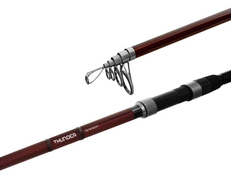 Základem tohoto prutu je velmi silný uhlíkový blank, který si poradí s plnou zátěží při nahazování, ale také při zdolávání kapitálních úlovků. Jednotlivé díly jsou osazeny pevnými očky se SiC výplní, které díky svému rozložení ideálně vedou vlasec a minimalizují tření. Použité DPS sedlo spolehlivě udrží na svém místě i největší navijáky. Délka rukojeti je srovnatelná s klasickými dělenými kaprařskými pruty, což umožňuje pohodlné a daleké nahazování. Na konci je rukojeť opatřena rozšířenou EVA pěnou, kvůli komfortnějšímu úchopu a snazší manipulaci.Jasným rozpoznávacím znakem tohoto modelu je charakteristická bordó barva. Oproti předchozí verzi jsme sérii THUNDER rozšířili o nové kompaktnější délky a to 300 a 330 cm.