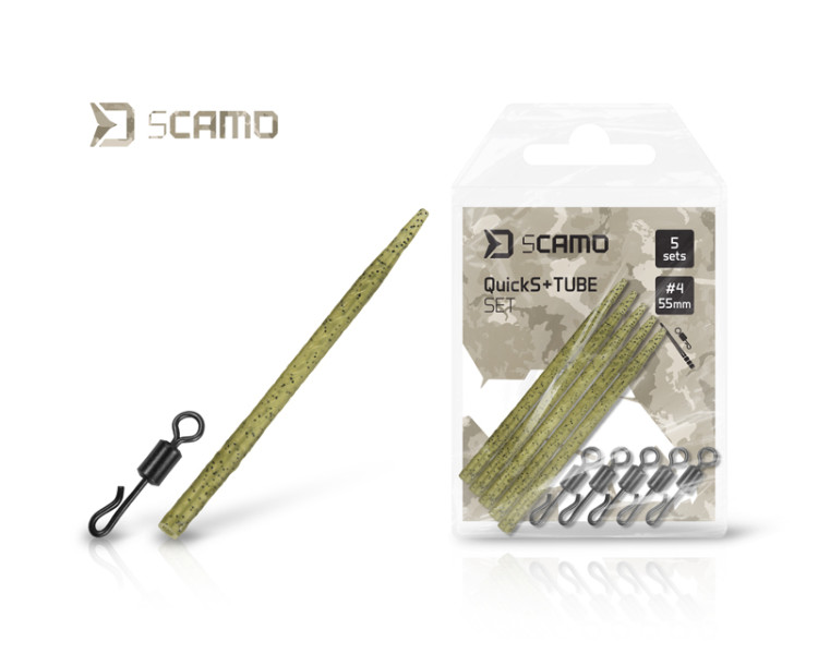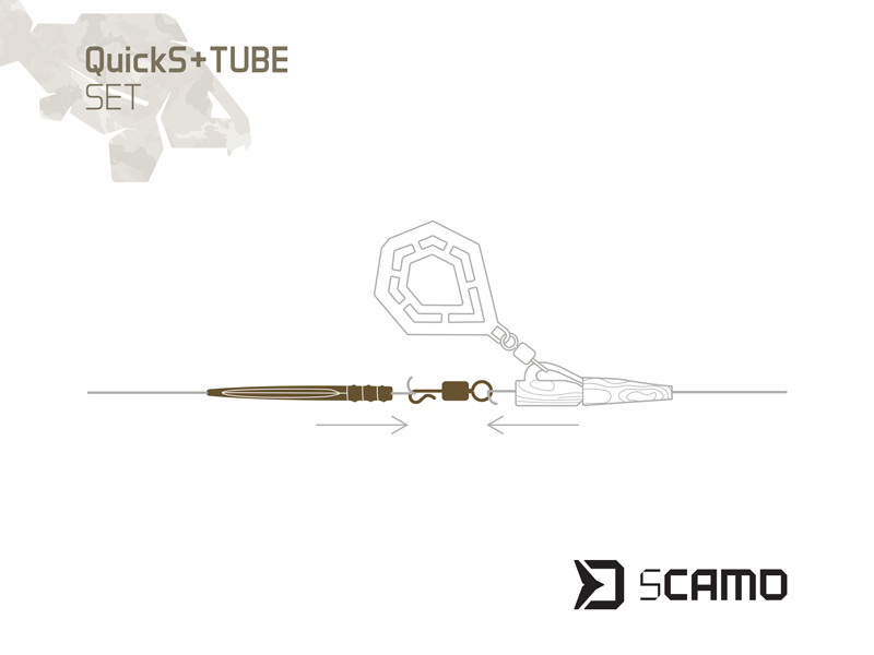 Praktický set kombinuje rychloupínací obratlík QuickS a gumičku proti zamotání ze série kaprařské bižuterie sCAMO. Rychloupínací obratlík vám umožní rychlejší a efektivnější vyměňování předem připravených návazců, zatímco gumička proti zamotání slouží ke spolehlivému zabezpečení montáže proti samovolnému vypadnutí návazce a zároveň účinně zabraňuje zamotání celé sestavy během nahazování. Povrchová struktura a zelená barva gumičky vytvářejí pod vodní hladinou dokonalý dojem stébla podvodní rostliny, čímž eliminuje jakékoli riziko vzbuzení zvýšené pozornosti u zvědavých kaprů. Celková délka gumičky je 55 mm, ale nenápadným, avšak o to sofistikovanějším prvkem jsou zářezy ve vrchní části, které jsou od sebe vzdálené 5 mm, čímž si gumičku můžete zkrátit na přesnou požadovanou délku.