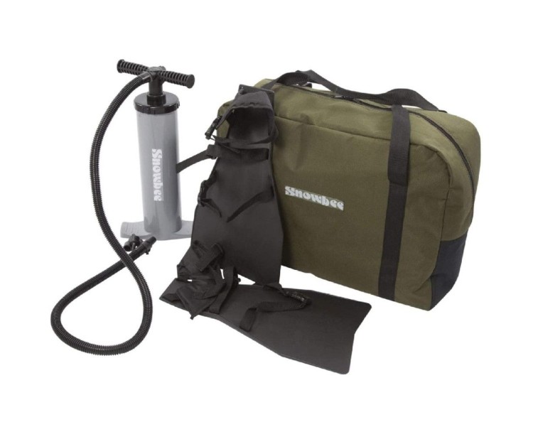 Belly Boat přichází na trh jako kompletní sada s ploutvemi, duální pumpou, vše uloženo v odolném batohu pro pohodlný transport.