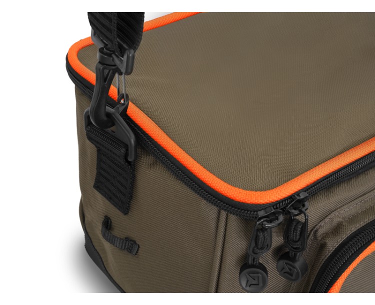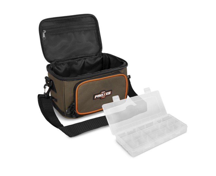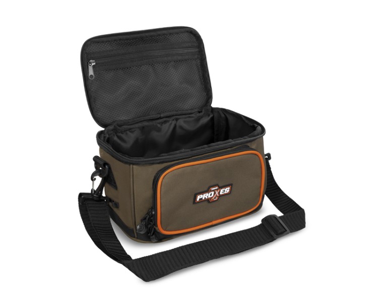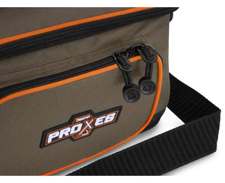 Delphin PROXES Easy L je kompaktní praktická taška, jejíž univerzálnost a provedení ocení zejména příznivci přívlače, feederu či plavané.Easy L, ale i jiné produkty ze série PROXES jsou specifické kvalitním provedením, vysokou praktičností, 100% funkčností a to vše za velmi příjemnou pořizovací cenu. Barevná kombinace řady PROXES poskytuje decentní vzhled ladící s přírodou. Oranžové lemy představují příjemný kontrast a zároveň poskytují lepší viditelnost za nepříznivých povětrnostních podmínek nebo za šera.Taška je zhotovena z kvalitních a odolných materiálů. Navíc je její spodní část dodatečně chráněna gumovou vrstvou přesahující nad dno tašky pro zamezení prostupu vlhkosti z mokré země. Hlavní část tašky tvoří dostatečně velký úložný prostor, ve kterém je již v základu umístěn průhledný plastový box s pořadatelnými přihrádkami, díky čemuž budete mít dokonalý přehled nad jeho obsahem. Box je svými rozměry vhodný například na přívlačové nástrahy, feederová krmítka, či jiné menší příslušenství.Přístup do hlavního úložného prostoru poskytuje kvalitní zip s taháčky a s logem značky Delphin. Víko tašky z vnitřní strany navíc ukrývá zipovatelnou kapsu ze síťoviny pro uložení drobné rybářské bižuterie nebo dokladů. Kromě toho taška nabízí další ukládací prostor ve formě zipovatelné kapsy na přední straně. Protože u všech našich produktů dbáme na detaily, i u tašky Easy L jsme na obou stranách tašky přidali poutka pro vložení peanu nebo kleští. Tašku lze pohodlně přenášet pomocí kvalitního, odepínatelného, délkově nastavitelného popruhu pro nošení přes rameno, nebo pomocí textilní rukojeti umístěné na víku.