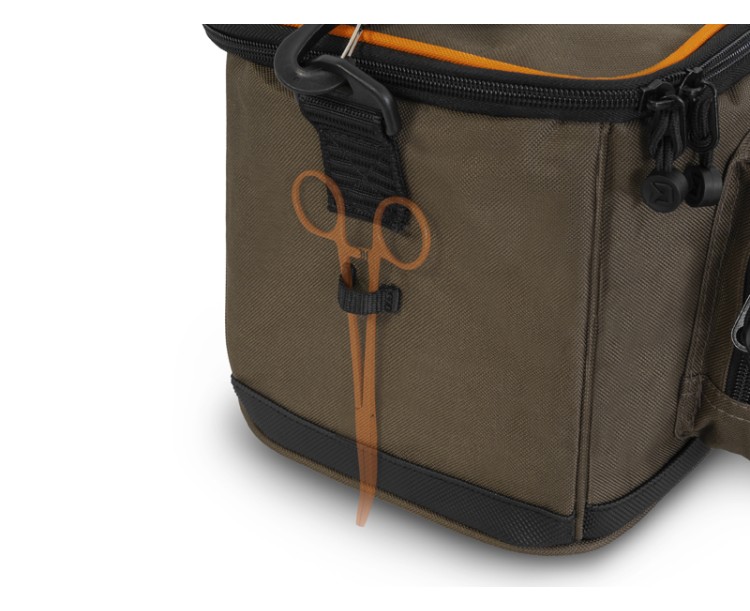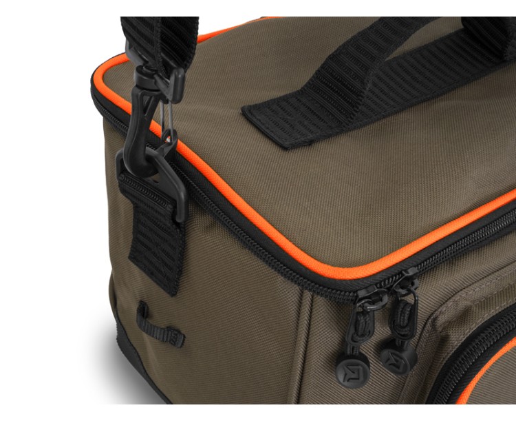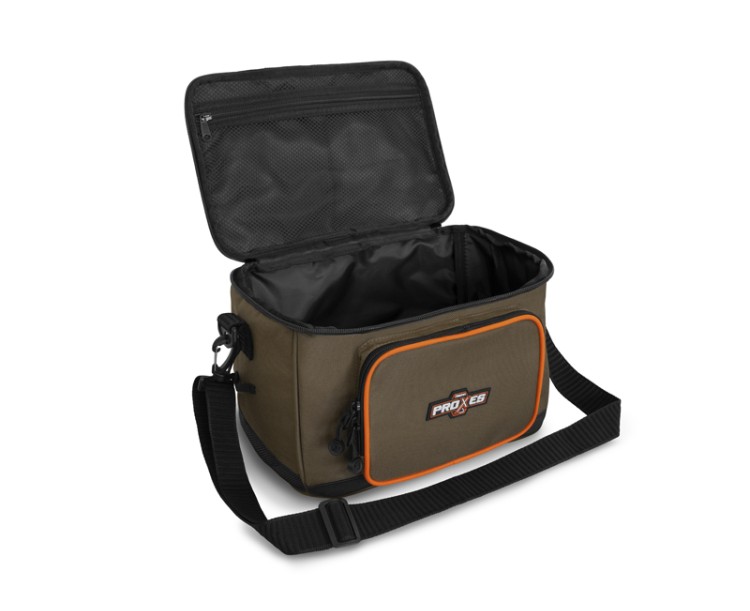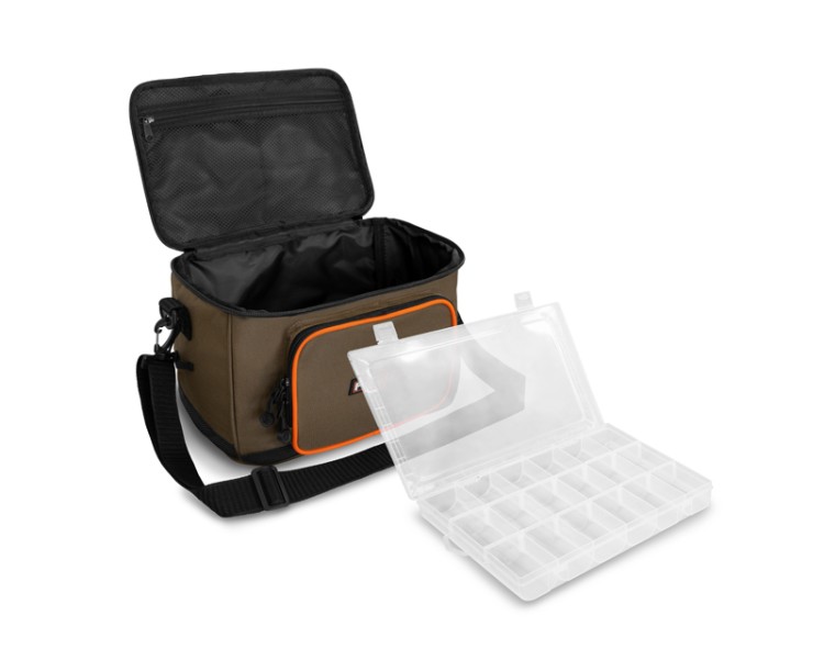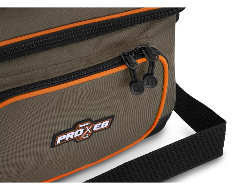 Delphin PROXES Easy XL je kompaktní praktická taška, jejíž univerzálnost a provedení ocení zejména příznivci přívlače, feederu či plavané.Easy XL, ale i jiné produkty ze série PROXES jsou specifické kvalitním provedením, vysokou praktičností, 100% funkčností a to vše za velmi příjemnou pořizovací cenu. Barevná kombinace řady PROXES poskytuje decentní vzhled ladící s přírodou. Oranžové lemy představují příjemný kontrast a zároveň poskytují lepší viditelnost za nepříznivých povětrnostních podmínek nebo za šera.Taška je zhotovena z kvalitních a odolných materiálů. Navíc je její spodní část dodatečně chráněna gumovou vrstvou přesahující nad dno tašky pro zamezení prostupu vlhkosti z mokré země. Hlavní část tašky tvoří dostatečně velký úložný prostor, ve kterém je již v základu umístěn průhledný plastový box s pořadatelnými přihrádkami, díky čemuž budete mít dokonalý přehled nad jeho obsahem. Box je svými rozměry vhodný například na přívlačové nástrahy, feederová krmítka, či jiné menší příslušenství.Přístup do hlavního úložného prostoru poskytuje kvalitní zip s taháčky a s logem značky Delphin. Víko tašky z vnitřní strany navíc ukrývá zipovatelnou kapsu ze síťoviny pro uložení drobné rybářské bižuterie nebo dokladů. Kromě toho taška nabízí další ukládací prostor ve formě zipovatelné kapsy na přední straně. Protože u všech našich produktů dbáme na detaily, i u tašky Easy XL jsme na obou stranách tašky přidali poutka pro vložení peanu nebo kleští. Tašku lze pohodlně přenášet pomocí kvalitního, odepínatelného, délkově nastavitelného popruhu pro nošení přes rameno, nebo pomocí textilní rukojeti umístěné na víku.