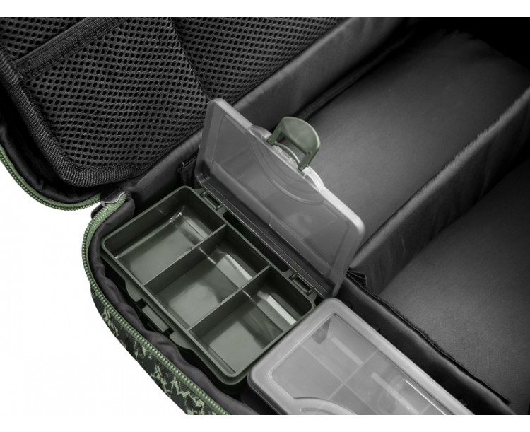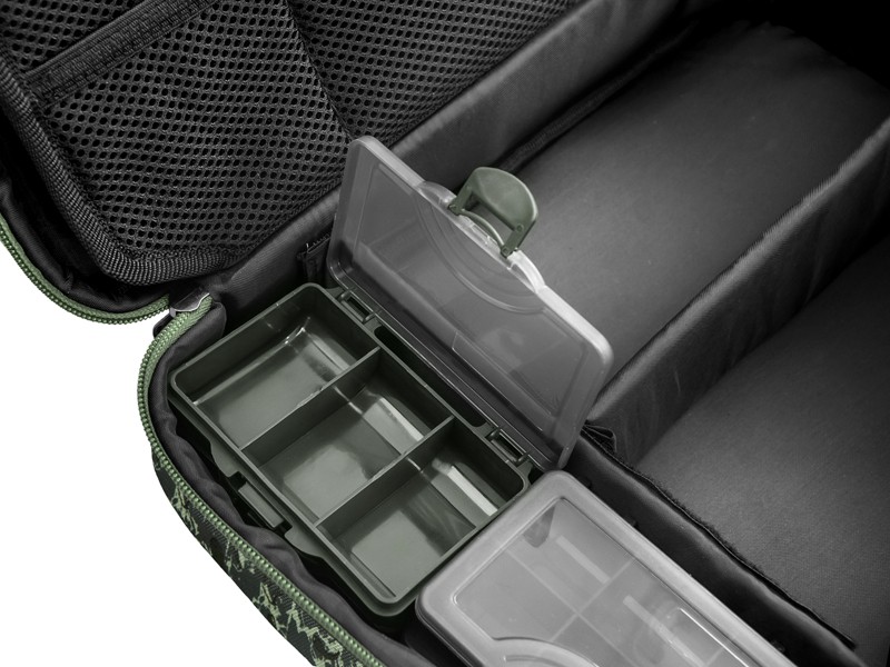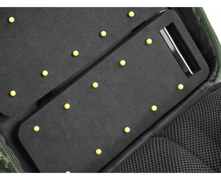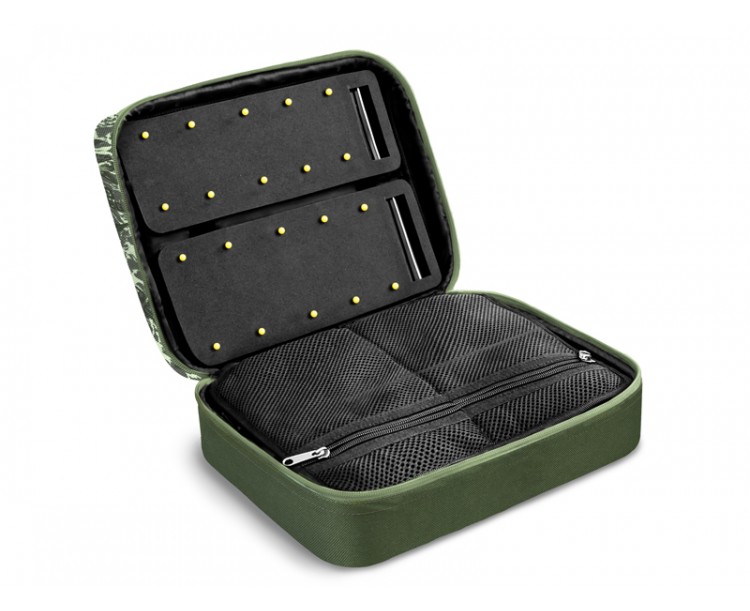 Hlavní přihrádka poskytuje velkorysý prostor pro uložení různé bižuterie, návazcových šňůr a nářadí potřebného k sestavení vašich montáží. Navíc se v ní nacházejí 4 praktické krabičky, ve kterých bude vaše bižuterie vždy v pořádku. Středový panel je opatřen malými síťovými kapsami na jedné straně a velkou síťovou kapsou na straně druhé. Díky tomuto provedení vždy vidíte, co se nachází uvnitř a bez problémů tak najdete vždy tu požadovanou část výbavy. RigStation obsahuje také dvě pěnové plochy sloužící k dokonalému uspořádání a uchycení vašich návazců. Devizou této tašky je také úchop, situovaný v horní části, díky čemuž tašku při transportu nepřevracíte a všechny komponenty v ní jsou tak stále na svém místě. Navíc je vybavena kvalitními zipy s efektními plastovými taháčky.