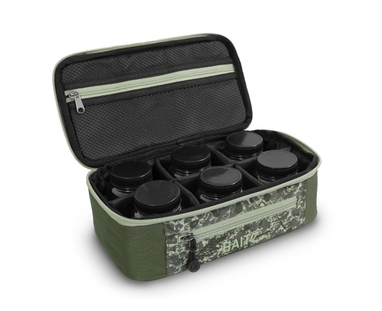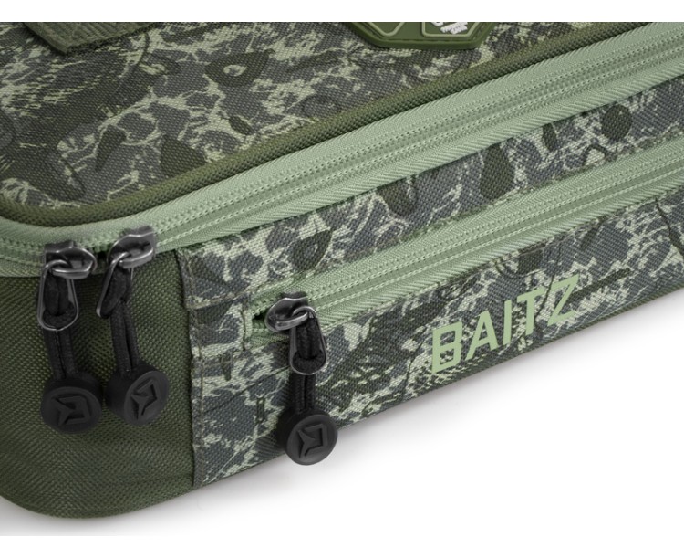 Delphin SPACE je označení pro exkluzivní sérii tašek z dílny značky Delphin. Vyznačuje se špičkovým zpracováním, kvalitními zipy, ale zejména výjimečným designem s použitím C2G kamufláže.BAITZ je kompaktní taška, speciálně navržená pro uskladnění a přenos dipovaných nástrah. V základu obsahuje 6 kusů transparentních plastových dóz s víkem a těsněním. Díky těsnění můžete do dóz bez obav uskladnit nadipované boilies, pelety či jiné nástrahy. Uvnitř tašky se nacházejí přepážky, které vytvářejí šest stejných individuálních přihrádek. Právě v těchto přihrádkách budou dózy s nástrahami vždy dokonale organizovány a připraveny k použití.Stěny a víko tašky jsou důkladně polstrovány 6mm silnou výstelkou, která chrání vnitřní obsah před mechanickým poškozením. Víko tašky je opatřeno síťkovou kapsou se zipem, do které lze uskladnit dodatečné rybářské příslušenství. Velkou výhodou je menší kapsa na přední straně, sloužící k uložení jehel nebo zarážek pro rychlou přípravu montáže. Kompaktní rozměry tašky spolu s textilní rukojetí umožňují snadný přenos.
