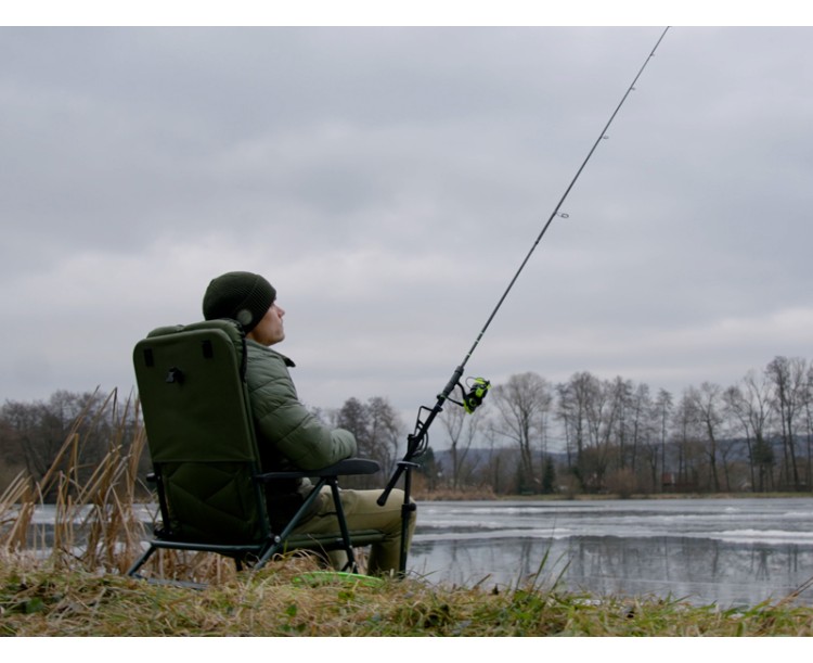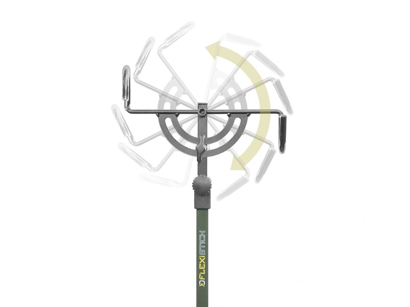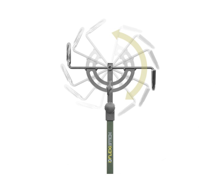 Držák je také polohovatelný pomocí kyvadlového mechanismu, takže si jej můžete nastavit do různých úhlů, ať už špičkou ke hladině, vodorovně nebo téměř kolmo vzhůru.Teleskopickou tmavě zelenou tyč lze vysouvat podle potřeby a navíc má čtvercový tvar, čili nehrozí nechtěné přetáčení prutu.Zapíchnutí do země je umožněno pomocí mohutného kovového trojzubce, který je mimořádně pevný, snadno proniká i tvrdším povrchem a lze jej zašlápnout nohou, případně zabít gumovým kladivem do půdy. Navíc je celá spodní část upevněna pomocí závitu a lze ji odšroubovat a skladovat odděleně.