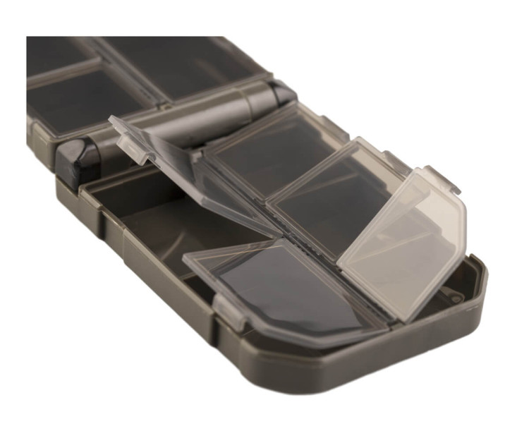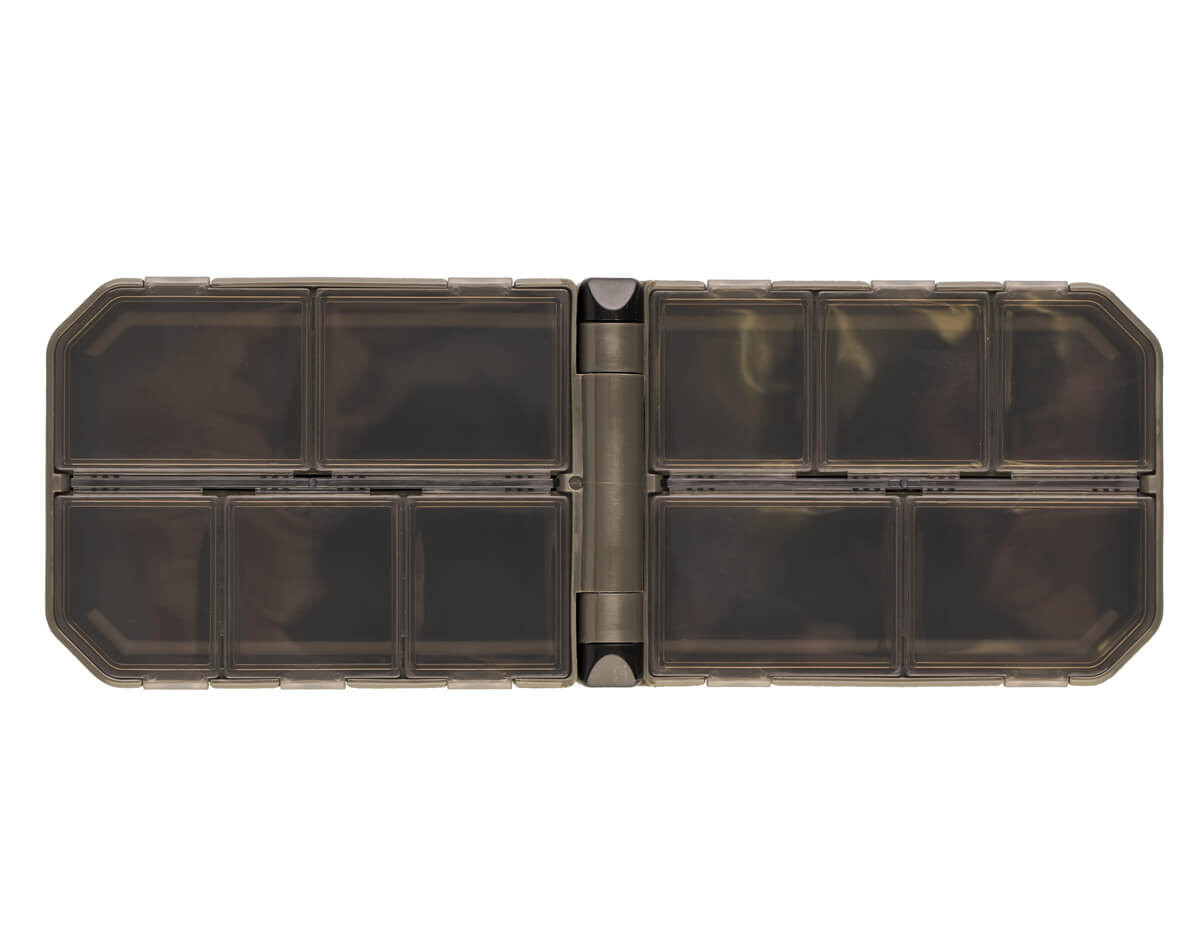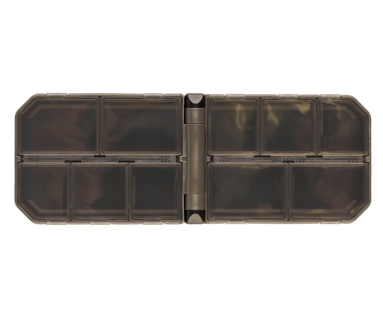 ZFISH Mini Double Box M je praktická oboustranná krabička/organizér od české značky ZFISH. Tento kompaktní box disponuje 10-ti samostatně uzavíratelnými přihrádkami s čirými krytem, takže snadno a ihned vidíte kam a pro co sáhnout. Bezpečné uzavírání, nebo nechtěné otevření zajišťují velice pevné panty. Jednoduchý a čistý design se zkosenými a oblými hranami nejen skvěle vypadá, ale díky oblým tvarům je i samotná manipulace mnohem příjemnější. Výborný dojem už jen podtrhují odolné materiály a komponenty ve velmi elegantním, temně olivově zeleném provedení. Tento kompaktní box je například vhodný na nejdrobnější bižuterii a příslušenství, které potřebujete mít vždy po ruce, ideálně někde v kapse.