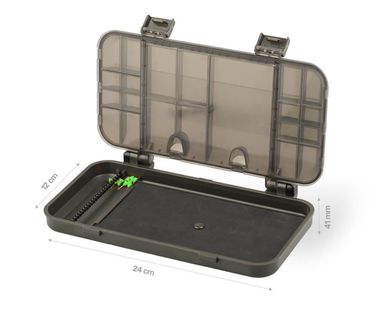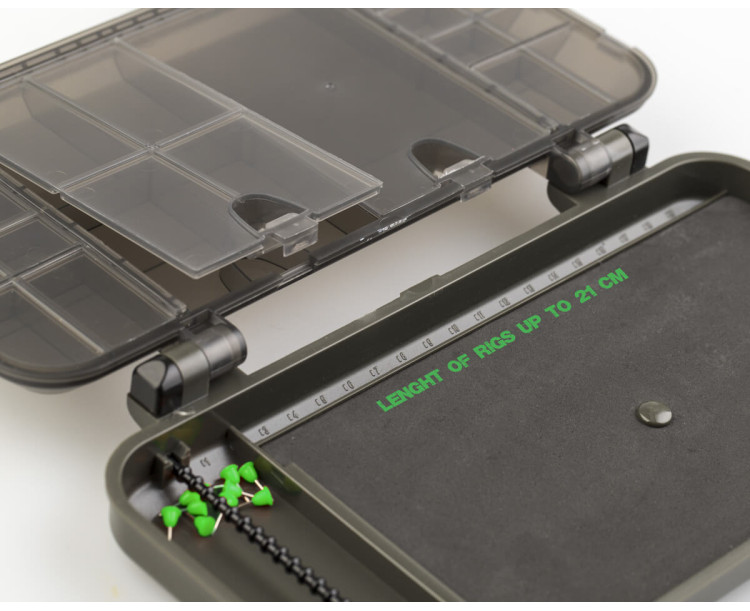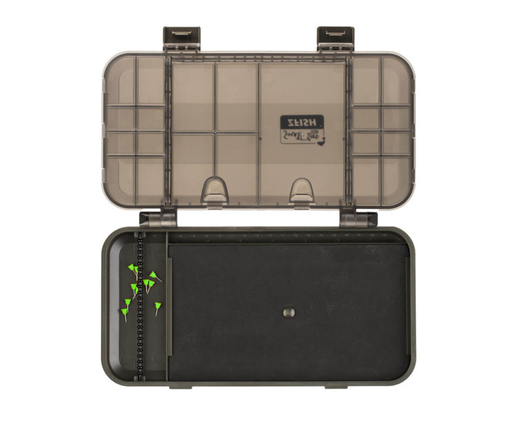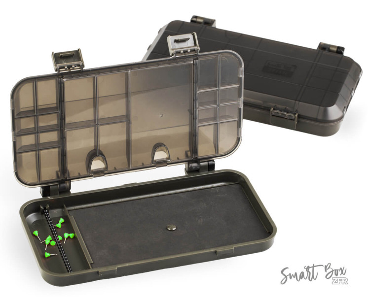 ZFISH Smart Box ZFR je praktický a univerzální organizér nebo-li tackle box od české značky ZFISH. Tento organizér je upravenou verzí oblíbeného boxu ZFS. Rozdíl spočívá ve spodní části, do které jsme umístili velkou plochu pro připevnění hotových návazců v délce až 21cm. Bezpečné uzavírání, nebo nechtěné otevření zajišťují dva zavírací klipy a velice pevné panty, které dokonce dokážou udržet box otevřený a usnadní Vám práci. Samotné víko boxu také funguje jako organizér a disponuje 21-ti menšími samostatně uzavíratelnými přihrádkami s čirými krytem, takže snadno a ihned vidíte kam a pro co sáhnout. Jednoduchý a čistý design se zkosenými a oblými hranami nejen skvěle vypadá, ale díky oblým tvarům je i samotná manipulace mnohem příjemnější. Výborný dojem už jen podtrhují odolné materiály a komponenty ve velmi elegantním, temně olivově zeleném provedení. Díky svým rozměrům se jedná o kompaktní box vhodný na kratší kaprařské nebo feeder vycházky do menších batohů.