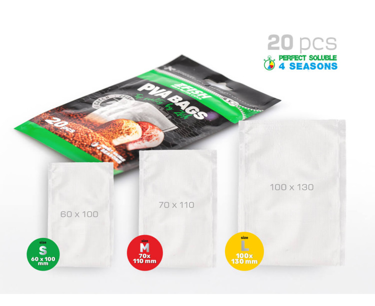 PVA sáčky, vyrobené z kvalitní japonské fólie, jsou ideální volbou k dokonalé prezentaci nástrahy i návnady na lovném místě. Lze je naplnit širokou škálou krmení od mikropeletek, boilies, method mixů, až po moderní tekuté posilovače, které PVA nerozpouštějí. Tyto sáčky mají velmi kvalitní podélné sváry, díky kterým je lze zcela naplnit bez obav z protržení i při těch nejprudších náhozech. V závislosti na teplotě a typu vody je doba rozpadu 25-50 vteřin. Náš tip: Při použití na řekách a v proudech doporučujeme před náhozem sáčky propíchnout, a naopak v případě lovu na bahnitém dně sáčky rozhodně nepropichovat !!! Pro dokonalé uzavření sáčků doporučujeme použít naše PVA nitě. Jsme si téměř jistí, že se naše PVA sáčky brzy stanou nepostradatelnou součástí Vaší krmné strategie.