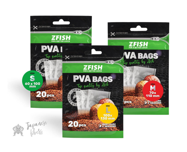 PVA sáčky, vyrobené z kvalitní japonské fólie, jsou ideální volbou k dokonalé prezentaci nástrahy i návnady na lovném místě. Lze je naplnit širokou škálou krmení od mikropeletek, boilies, method mixů, až po moderní tekuté posilovače, které PVA nerozpouštějí. Tyto sáčky mají velmi kvalitní podélné sváry, díky kterým je lze zcela naplnit bez obav z protržení i při těch nejprudších náhozech. V závislosti na teplotě a typu vody je doba rozpadu 25-50 vteřin. Náš tip: Při použití na řekách a v proudech doporučujeme před náhozem sáčky propíchnout, a naopak v případě lovu na bahnitém dně sáčky rozhodně nepropichovat !!! Pro dokonalé uzavření sáčků doporučujeme použít naše PVA nitě. Jsme si téměř jistí, že se naše PVA sáčky brzy stanou nepostradatelnou součástí Vaší krmné strategie.